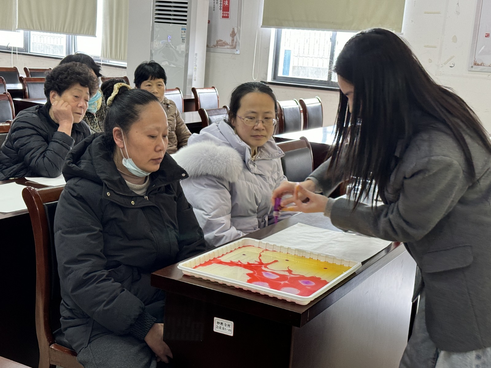活动现场暖意融融,工作人员提前备好水拓画液、颜料、纯白丝巾、画针等材料。专业老师现场讲解水拓画的非遗渊源与制作步骤,从滴色、晕染、勾勒到拓印、固色,一步步示范指导,让大家快速掌握技巧。