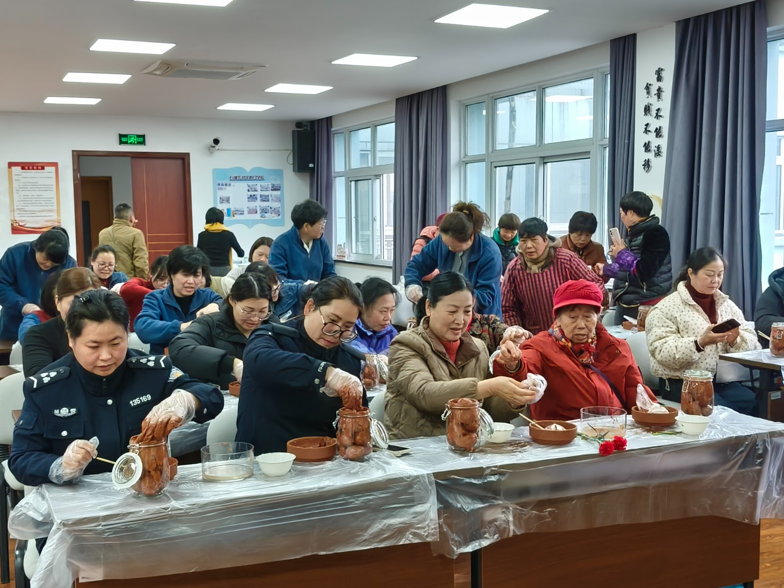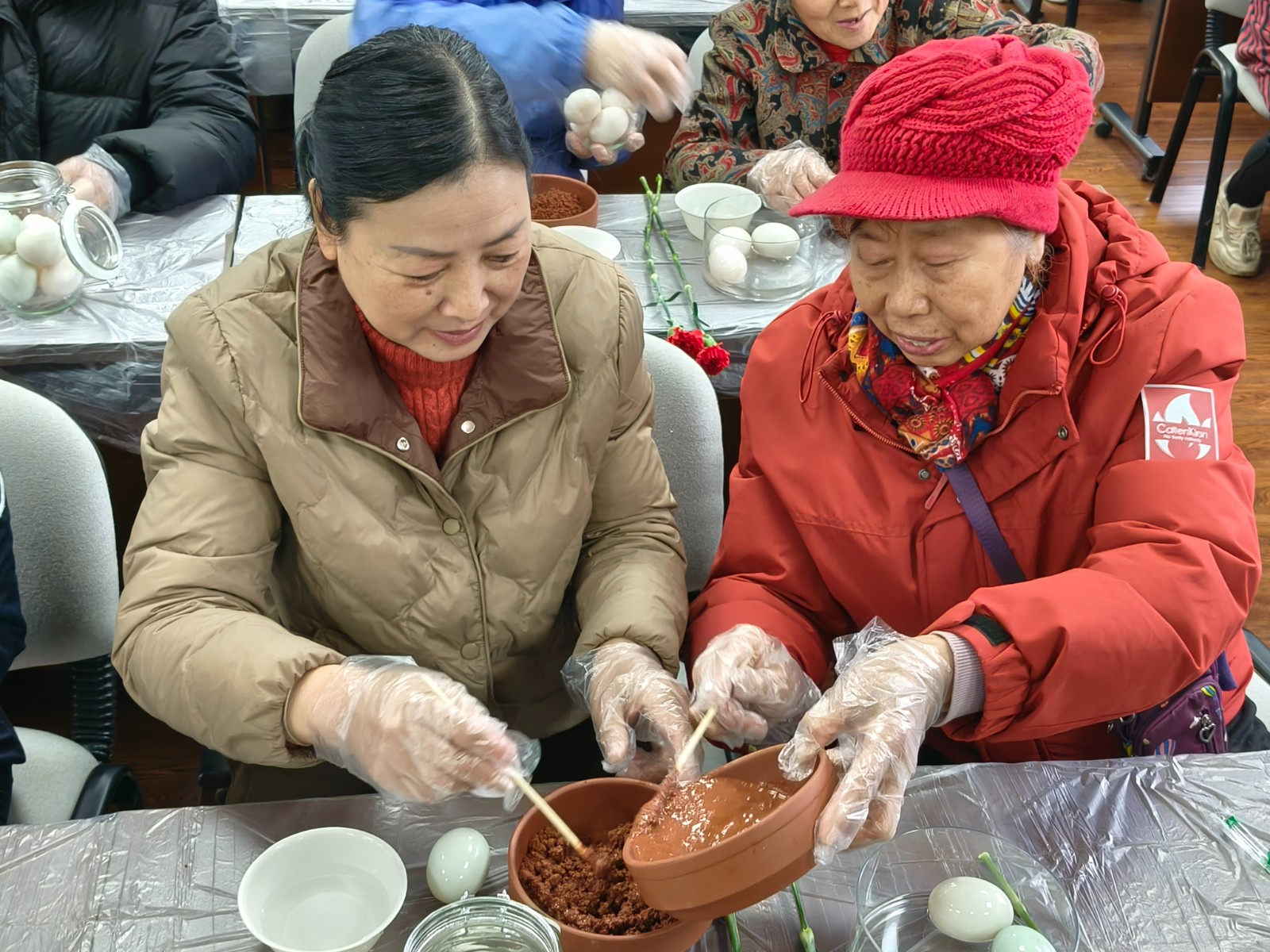 活动现场,社区网格员早早备好了新鲜的青皮鸭蛋、细腻的红泥、精盐和高度白酒。王老师一边示范一边讲解:“古法腌蛋,讲究的是耐心和手感。先用白酒给鸭蛋洗个澡,既能杀菌又能提香再把红泥和盐调匀,薄薄裹上一层,不能太厚也不能太薄,厚了进不去味,薄了容易坏……”话音落下,大家便迫不及待地动起手,活动室里顿时热闹起来。有人小心翼翼地捧着鸭蛋在酒碗里打转,有人专注地调配着红泥的干湿,还有两人配合着,一个抹泥一个装坛,时不时传来“你这裹得真”“慢点慢点,坛口当心”的相互提醒。一双双沾满红泥的手,传递的不仅是古法技艺,更是代代相传的生活智慧。坛子里封存的也不仅仅是咸鸭蛋,还有大家对平凡日子的热爱和对美好生活的期盼。