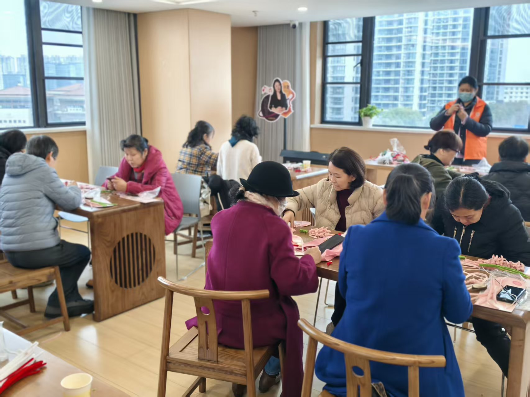 活动现场暖意融融,大家围坐一起,专注制作扭扭棒花朵。一根根毛茸茸的扭扭棒,在居民们的巧手中变身成可爱的花瓣与翠绿的叶子,再经过细心组合,成为一束束独一无二、精致可爱的手工花。大家在轻松愉悦的氛围里交流互动,尽情享受动手创作的乐趣,收获满满的成就感。