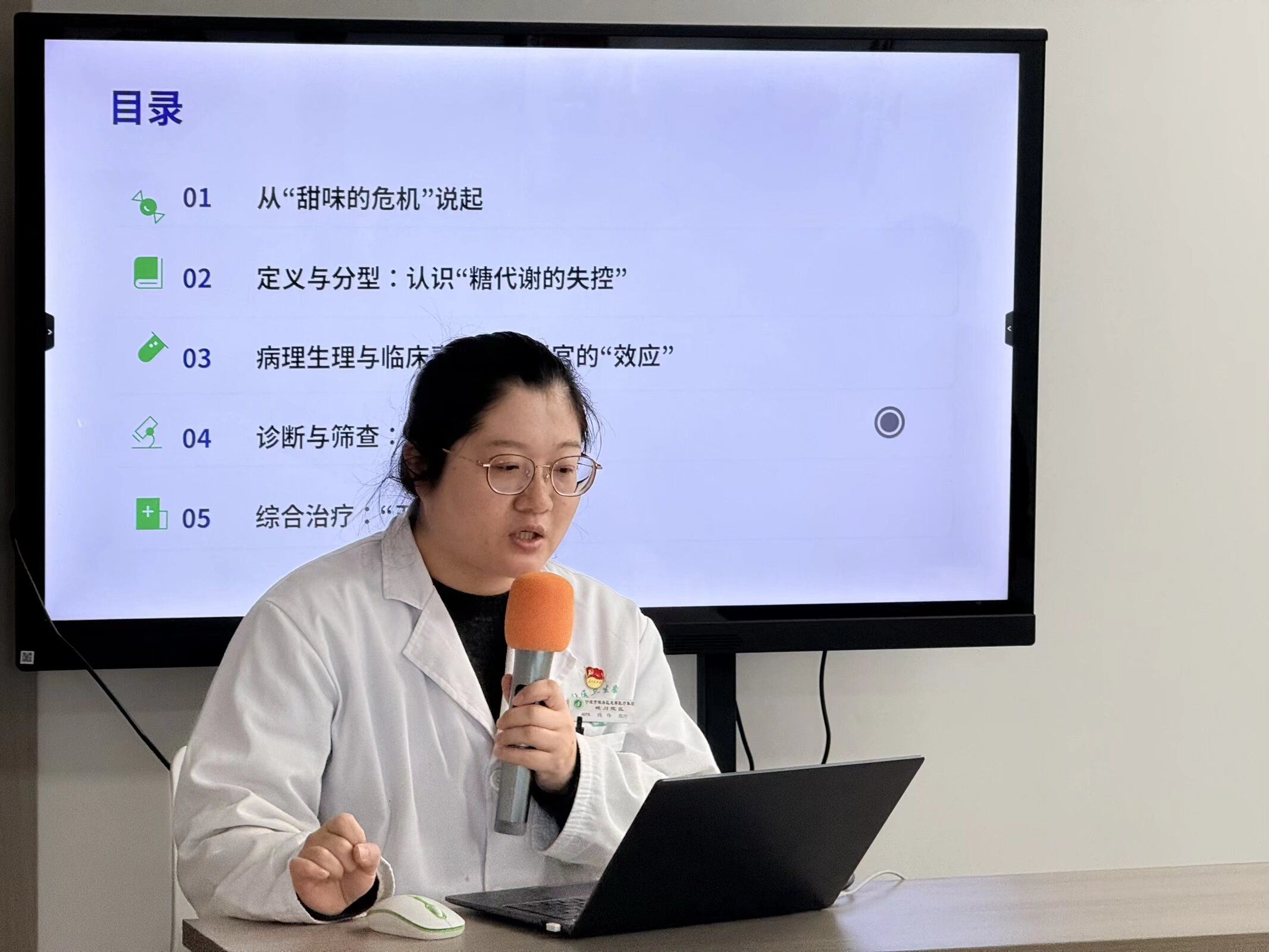 社区活动室内座无虚席,前来听课的居民以中老年人为主。卫生站钱医生结合PPT课件,用通俗易懂的语言向在场居民讲解了什么是糖尿病、糖尿病的典型症状、糖尿病的危害以及如何科学管理血糖等知识。钱医生重点强调了合理膳食、适量运动、定期监测血糖的重要性,并纠正了部分居民关于“少吃糖就不会得糖尿病”的认识误区。