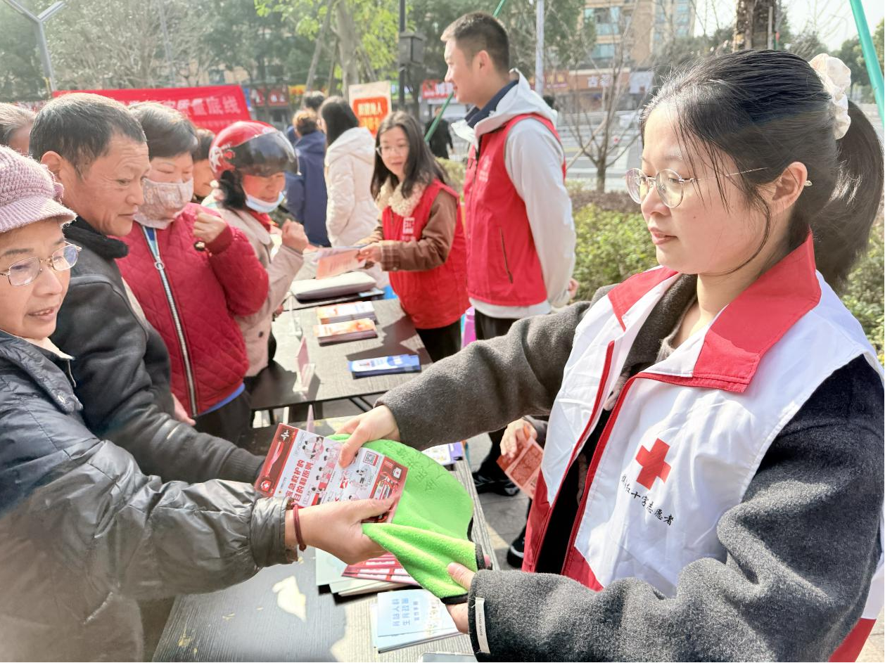 活动现场人头攒动,身穿红马甲的网格员、宣教老师与社区红十字志愿服务队志愿者们分工协作,通过设立咨询台、发放宣传手册、面对面讲解、案例剖析等形式,向过往居民普及“三救三献”核心知识、消费者权益保护法律法规及垃圾分类环保知识。
