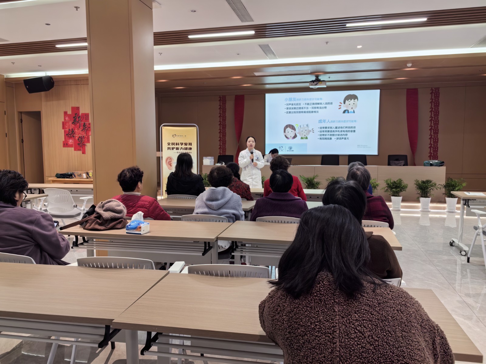 “很多叔叔阿姨觉得听不清是年纪大了的正常现象,其实不然。”活动现场,邬老师用通俗易懂的语言,为前来参加活动的老年朋友系统讲解了老年听力健康的全程管理知识。在听力自检环节,邬老师通过提问引导大家思考日常生活中的听力状况,例如是否存在经常听错别人说的话、听得见声音却听不清内容等情况,并提醒大家,一旦出现这些“警示信号”,应引起重视,及时进行专业检查。