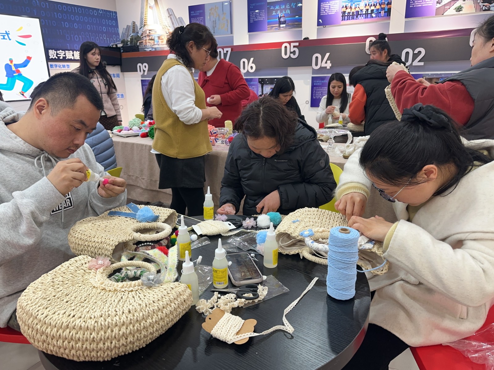 启动仪式后,还接续开展 “阅见北仑” 职工读书分享会,在书香中探讨职场与生活中的有趣心理学现象。接着手作体验活动开始了。职工们围坐在一起,在孙人建老师的带领下,将普通的麻绳通过编织、缠绕,变废为宝。“你看,我这个包底编得紧不紧?”“哇,你这个花样好看,快教教我!”现场你一言我一语,原本素不相识的工友们因为一根麻绳熟络起来。一位来自模具企业的年轻职工举着刚完成的作品笑着说:“平时在车间跟机器打交道,没想到自己也能做出这么好看的手工包!这种动手的课程特别解压,做完特别有成就感。最关键的是,大家坐在一起边做边聊,感觉整天的疲惫都被治愈了。”