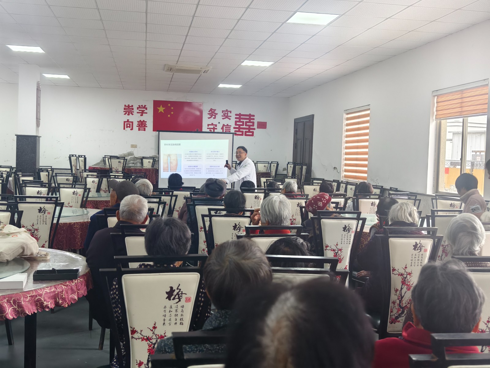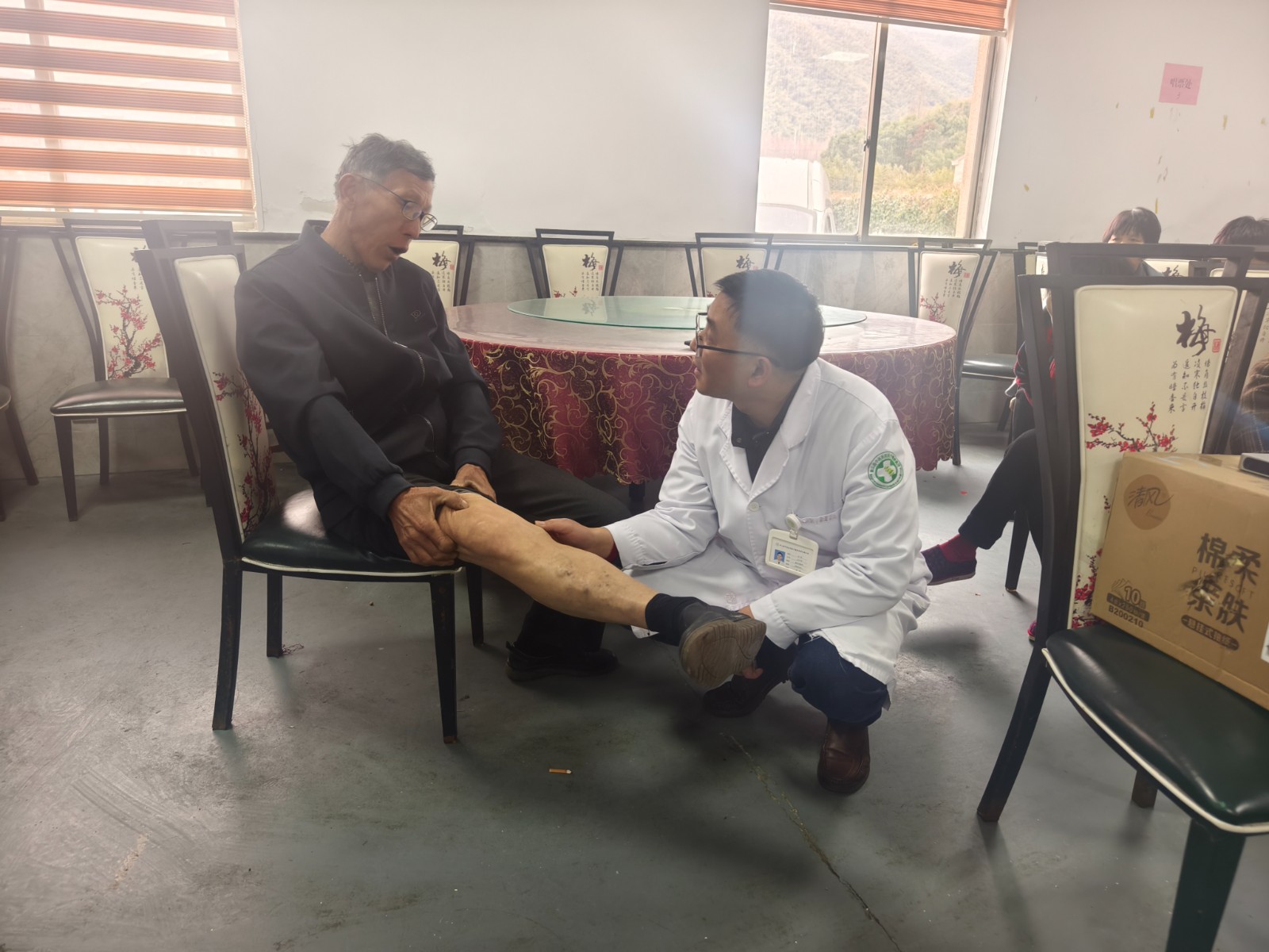 讲座结束后,孙医生还为现场部分村民进行了义诊。他耐心地为村民触诊检查,细致解答关于腿部酸胀、血管凸起等疑问,并针对个人体质与生活习惯,给出了个性化的诊疗建议和康复指导。