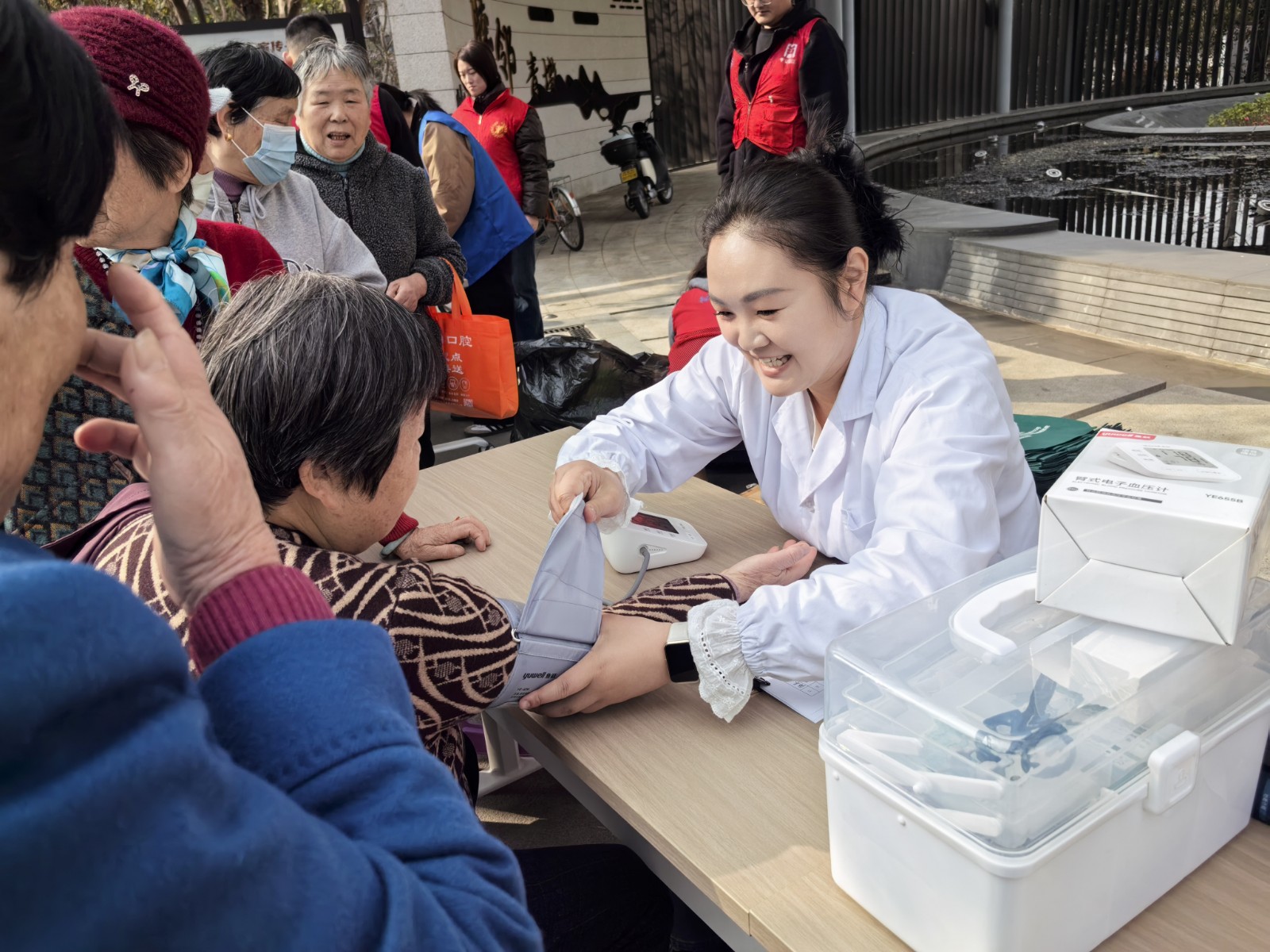 与有害垃圾兑换区紧邻的整合了多种便民服务资源的集市,设置了多个服务摊位,切实满足了居民的日常生活需求。在便民服务摊位前宁波鼎植口腔医院的志愿者们正耐心地为居民进行口腔义诊。他们借助口镜仔细检查居民的牙齿健康状况,针对老年人常见的牙周炎、牙齿松动等问题给予专业的护理建议,并贴心地送上牙刷和护牙手册。此外,还有血压检测、爱心理发、小家电维修等摊位,为居民提供了全方位的贴心服务。
