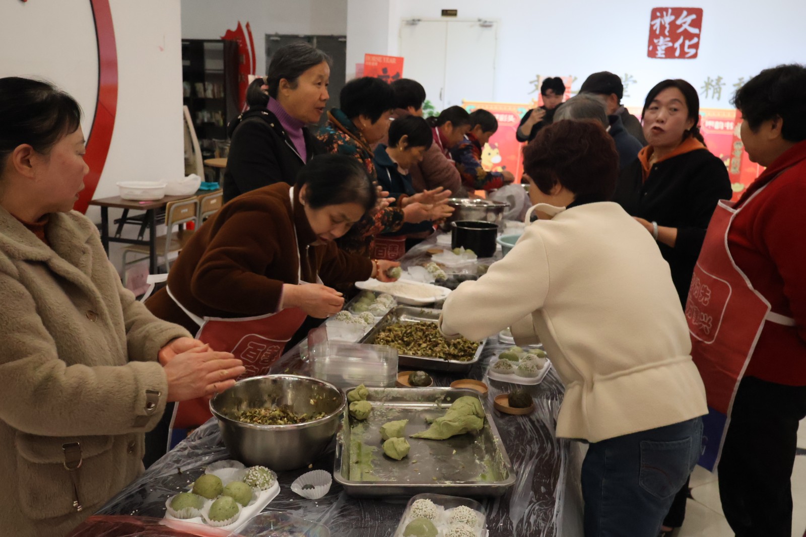 随后,包青团环节正式开始。绿色的艾草汁融入雪白的糯米粉,不一会儿就变成了光滑的面团。企退人员们分组围坐,有的手法娴熟,一捏一揉间便包出圆润饱满的青团;有的虽是初次尝试,也在志愿者的帮助下学得有模有样。大家一边切磋技艺,一边唠着家常,现场欢声笑语不断。经过近一个小时的忙碌,桌上摆满了形态各异、绿意盎然的青团。