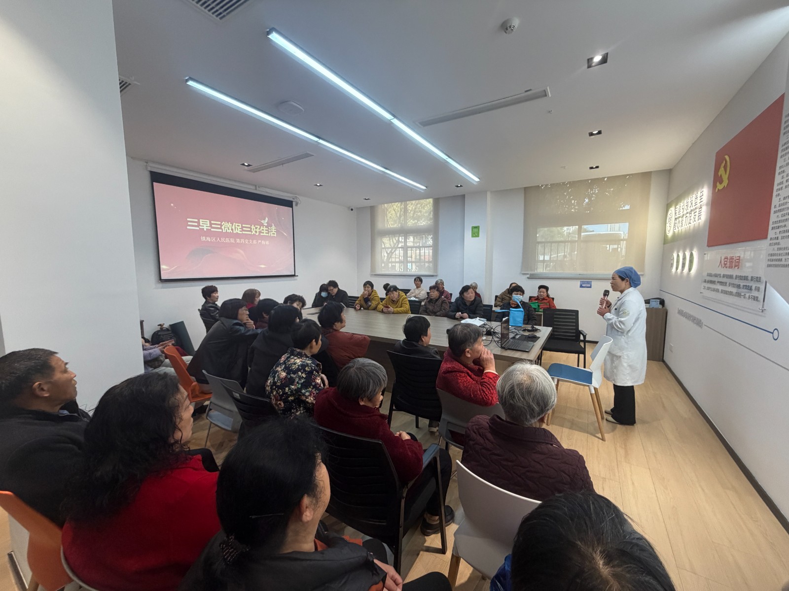 为切实提升辖区居民健康素养,把优质医疗资源送到 “家门口”,今天下午,岚湾社区携手镇海区人民医院成功举办公益义诊活动,活动现场设置健康讲座、专家咨询、基础检测等多个服务区域,内容丰富且贴合居民需求。区人民医院派出骨科、康复科等科室资深专家,为居民提供一对一专业咨询,细致解答骨骼健康、康复调理等相关问题。同时,现场免费开展血糖、血压测量、康复项目体验及 B 超检查,医护人员严格按照规范流程操作,准确记录数据并给出个性化健康建议。健康讲座环节,医护人员结合居民常见问题,通俗易懂地普及慢性病预防、日常养生保健等知识,现场互动热烈。