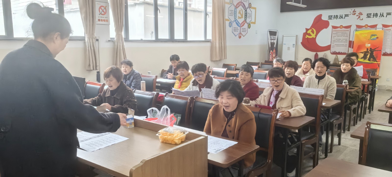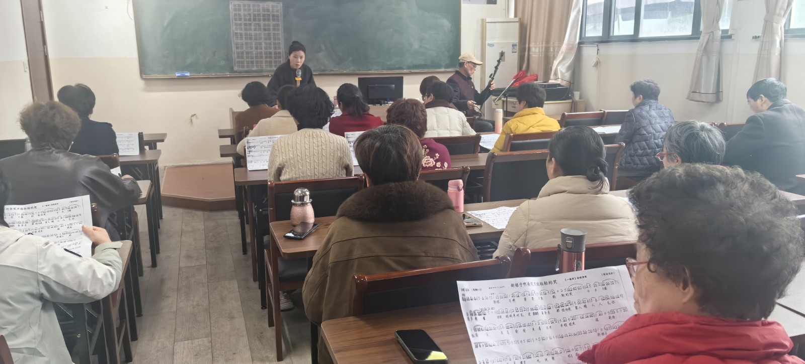 327日下午陆埠成校一楼教室里热闹非凡这是本学期的第一堂课。30多名来自各村居委的越剧爱好者正在老师的指导下练唱越剧