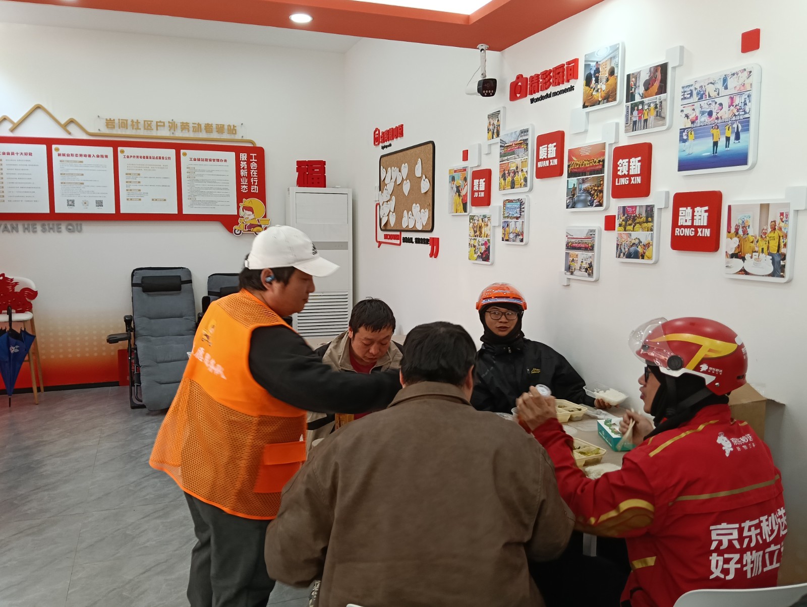 3月30日下午,岩河社区户外劳动者驿站内暖意融融,由岩河社区网约配送联合工会,联合盛友会北仑镇海分会、辖区爱心商家共同发起的“食光有爱”项目正式启动。每日为外卖骑手免费派送30份爱心餐食,在传递社区关怀的同时,创新融入公益循环与环保实践,让“暖胃”行动更添文明底色。