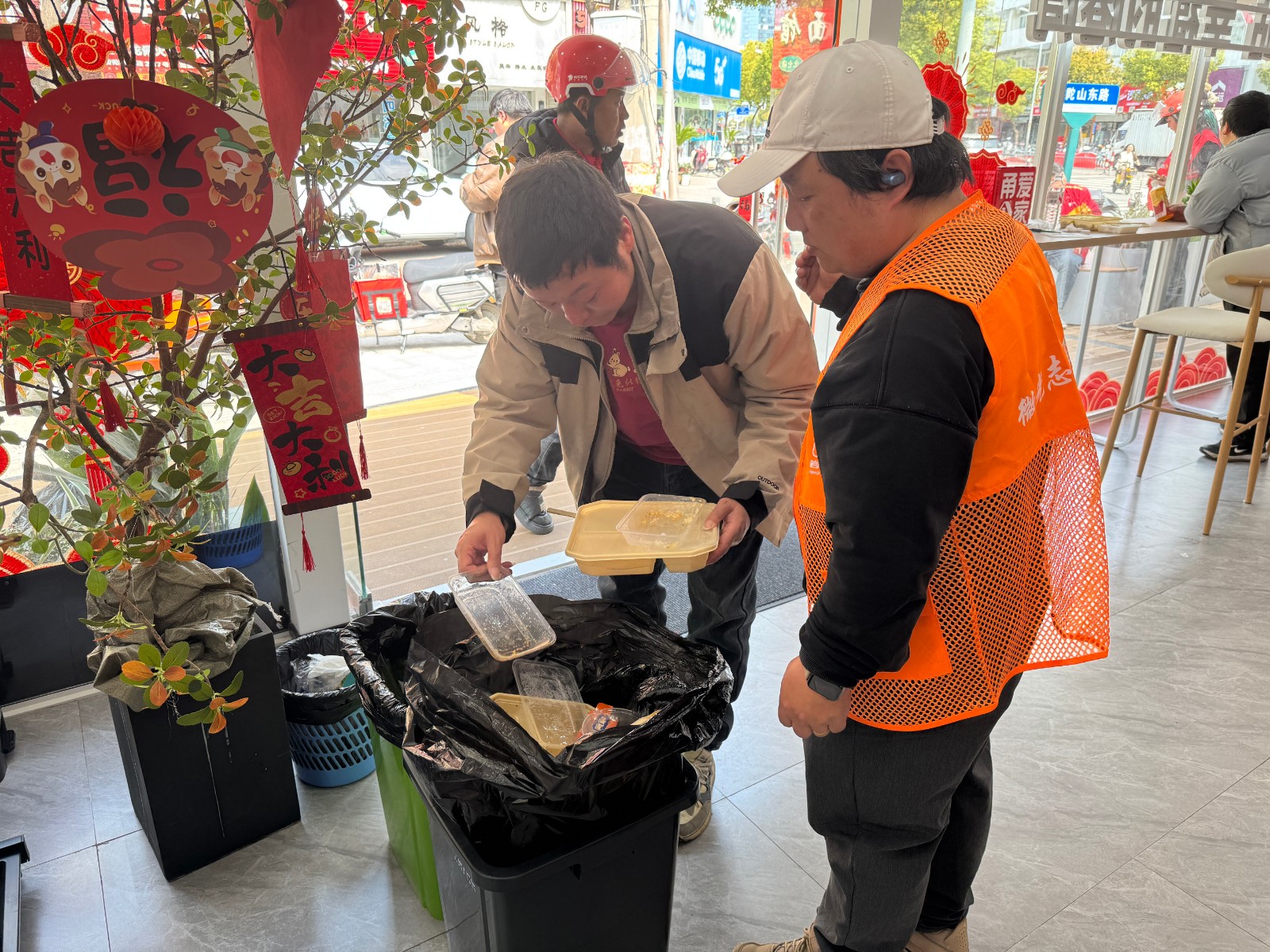 在就餐区旁,一场垃圾分类微课堂同步展开。骑手们在用餐结束后,主动将餐盒、筷子、剩饭剩菜分类投放至现场设置的分类垃圾桶中。社区工作人员及“碶上微光”志愿者耐心讲解分类要点,引导大家准确区分厨余垃圾与其他垃圾。“平时送餐忙,有时对分类细节顾不上,今天边吃饭边学习,以后会更注意。”骑手小李将餐后垃圾正确投放后感慨道。