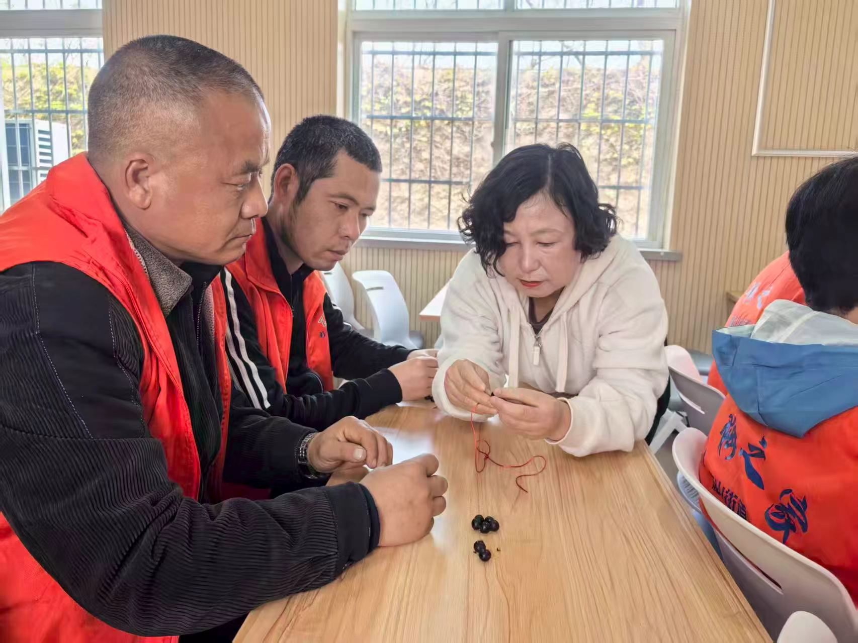 制作中,老师与工作人员全程贴心陪伴、手把手指导,考虑到托养人员动手能力参差不齐,特意放慢节奏,逐一走到身边,耐心纠正串珠、编绳的手法,对手部协调性较弱的人员,更是握着他们的手辅助操作,轻声鼓励,确保每位参与者都能跟上进度。现场氛围轻松融洽,托养人员们兴致勃勃,小心翼翼地将无患子串挂绳、配流苏,彼此间主动交流制作技巧,互相帮忙递材料、调整挂件样式,欢声笑语不断,在互动中拉近了彼此的距离。