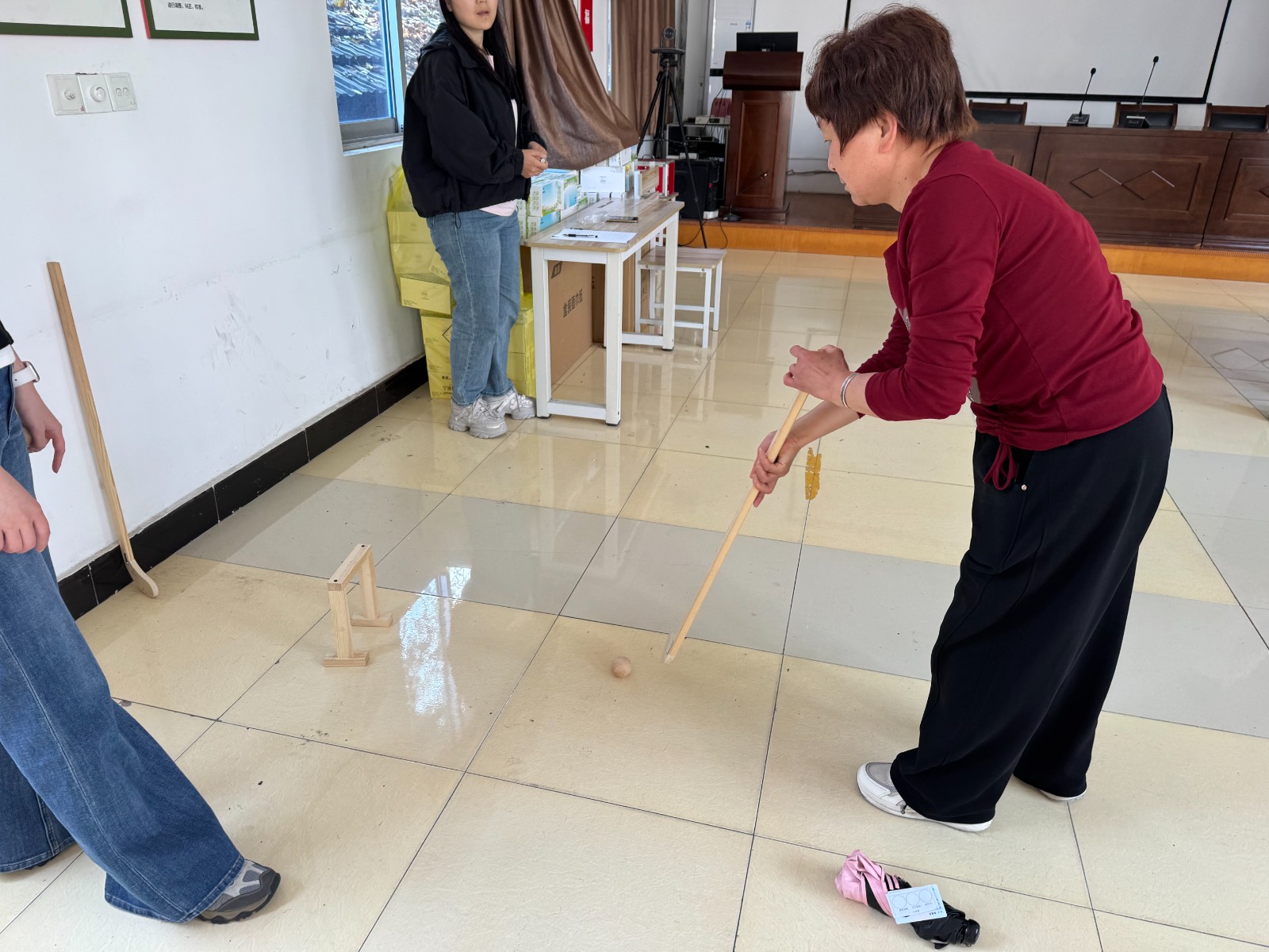 不远处的“一杆进洞”游戏同样人气高涨。老人们手握木杆,目光专注,轻推小球穿越“门洞”。这项活动既考验眼手协调能力,又兼具运动趣味,不少老人一试再试,享受着运动带来的活力与乐趣。社区工作人员和志愿者在一旁加油鼓劲,并时刻关注老人们的身体状况,确保活动安全有序。