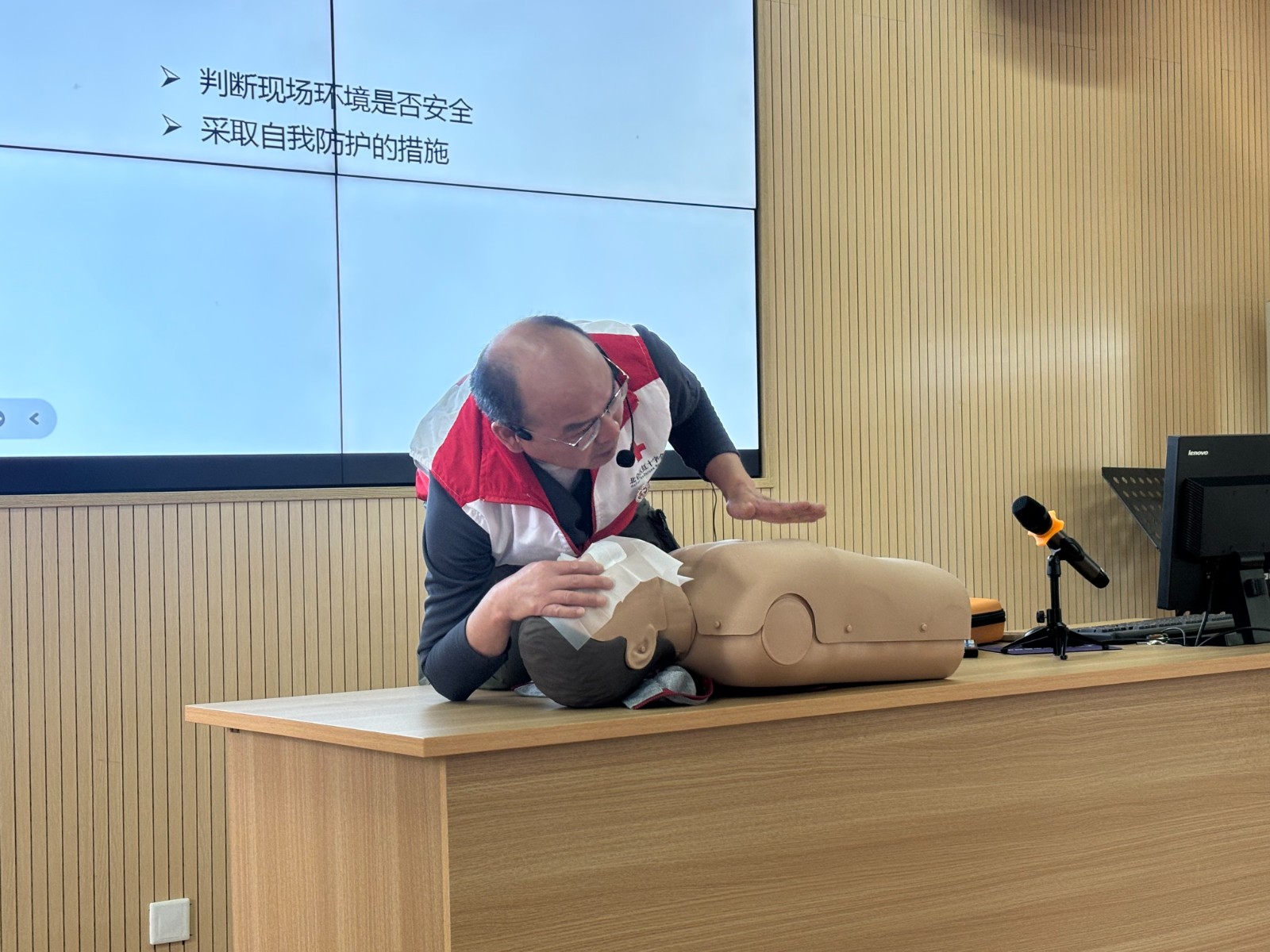 为提升企业从业人员应急救护能力,夯实安全生产基础,2026年4月18日,小港成校联合山下社区,特邀宁波红十字会讲师李甬江,在成校一楼阶梯教室开展急救技能专项培训。