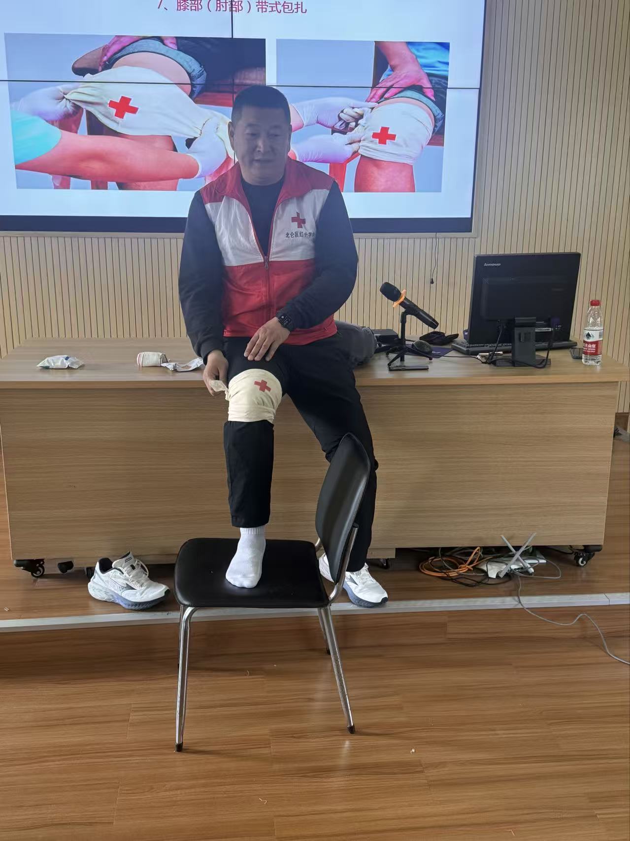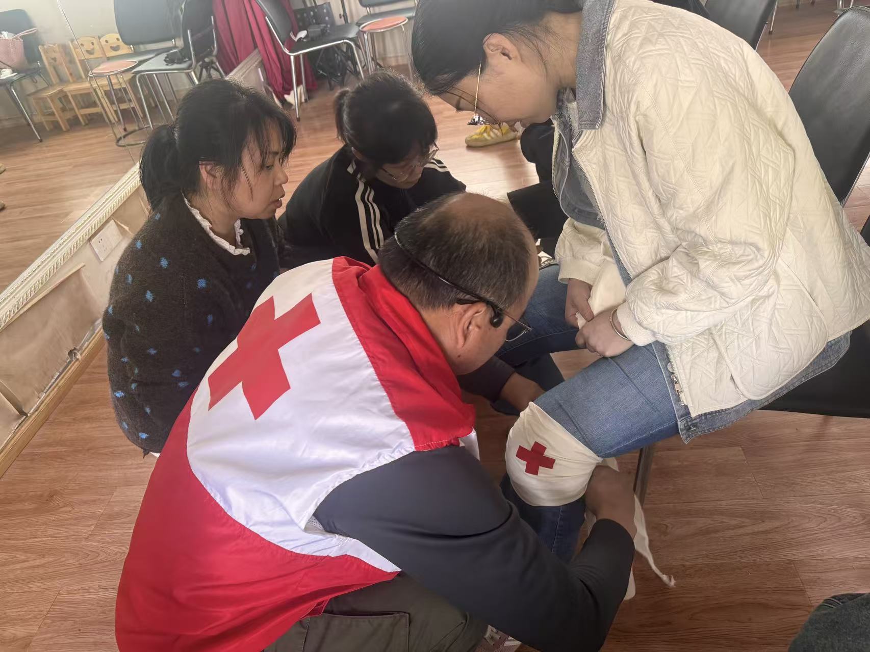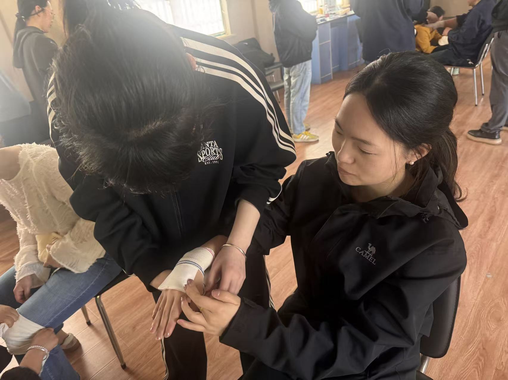 下午重点传授实用包扎技巧,针对头部、膝盖、手部等易受伤部位,演示三角巾、绷带的规范包扎方法,强调包扎原则与注意事项。学员认真观摩练习,讲师巡回指导、纠正误区、解答疑问,确保全员掌握规范操作。