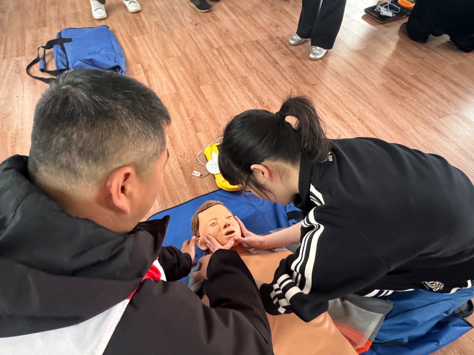 培训为期一天,分上、下午两阶段推进。上午聚焦核心急救技能,讲师围绕心肺复苏(CPR)、AED规范使用、成人气道异物梗阻急救展开讲解,结合真实案例拆解关键步骤,示范海姆立克急救法动作要点。学员两两分组实操,熟练掌握急救技能。