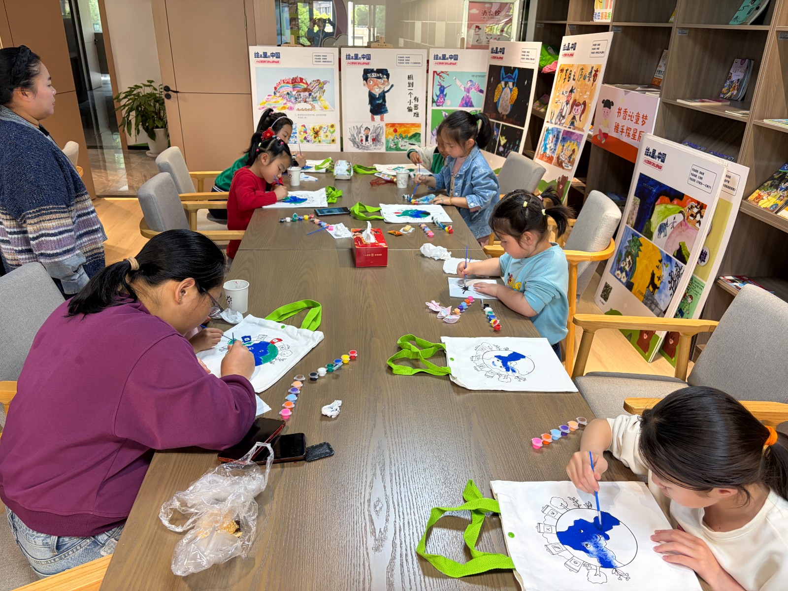 最热闹的环节当属“巧手绘文明 环保‘袋’回家”活动。社工为孩子们分发空白环保袋、画笔和颜料,孩子们充分发挥想象力,将垃圾分类四色桶、美丽的地球妈妈、可爱的动植物图案绘在环保袋上,一笔一画都充满童趣与创意。不一会儿,一个个带有创意的环保袋新鲜出炉,孩子们捧着自己的作品,脸上洋溢着自豪的笑容,纷纷表示要带着环保袋出行,践行低碳生活。