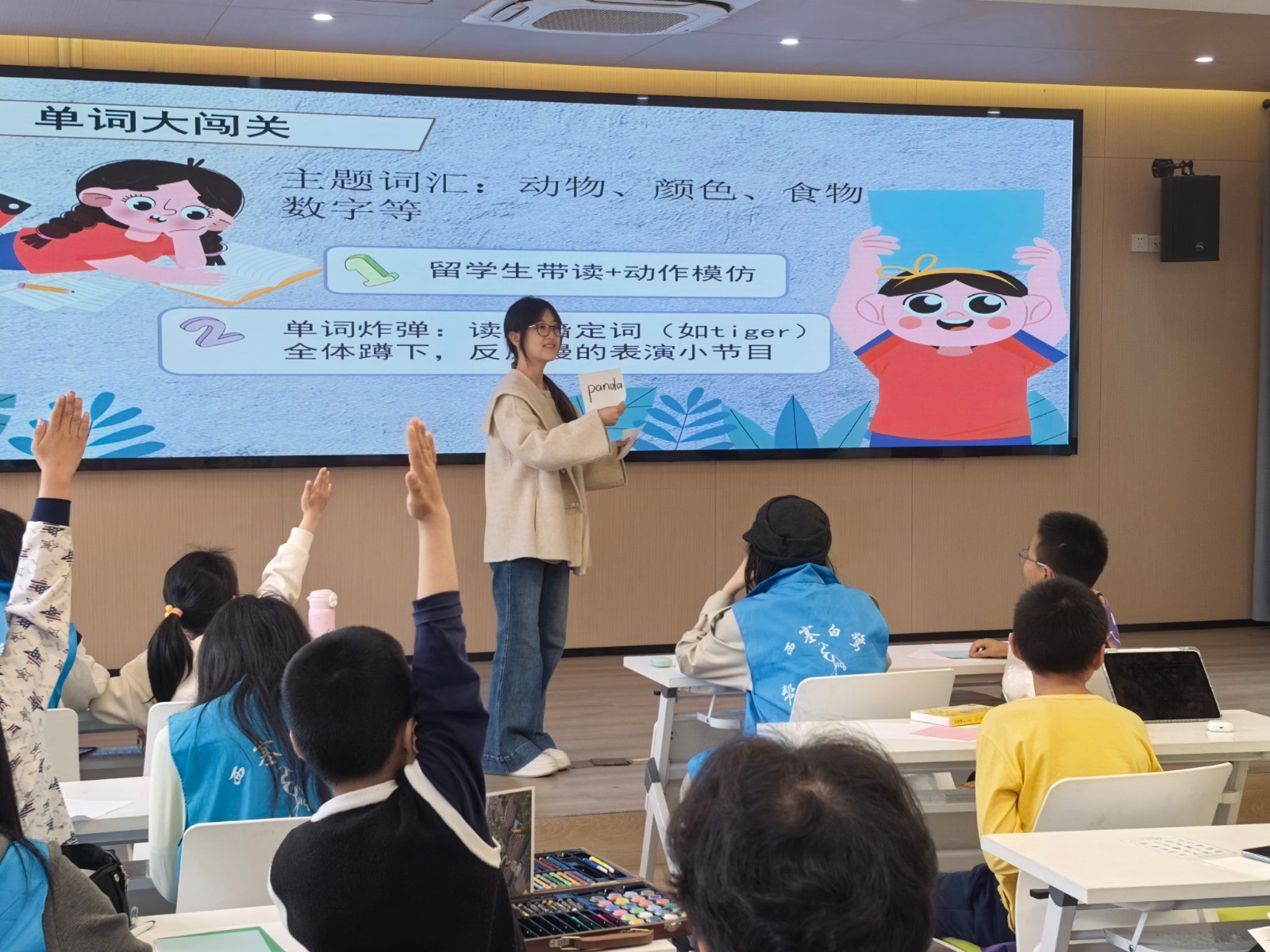 今年以来,文竹社区持续深化基层治理与服务,主动将在社区知识学堂和小候鸟学堂基础上延续了10余年的托管品牌升级为“双减”多彩公益课堂,为辖区青少年构筑起充实快乐的“第二学校”。值得一提的是,十余年来,“双减”公益课堂一直主要由宁波大学西塞白鹭帮困助学社的志愿者们负责开展,这支充满青春力量的队伍始终坚守在社区阵地,为孩子们带来丰富多彩的课程。近日,在这方充满欢声笑语的阵地里,多了一道独特的国际化风景线——来自宁波大学商学院的优秀留学生群体化身社区“外教”,利用自身的海外背景与语言优势,为辖区新就业群体的子女送上了生动有趣的外语课,生动展现了文竹社区的积极作为与宁大商学院的深度配合。