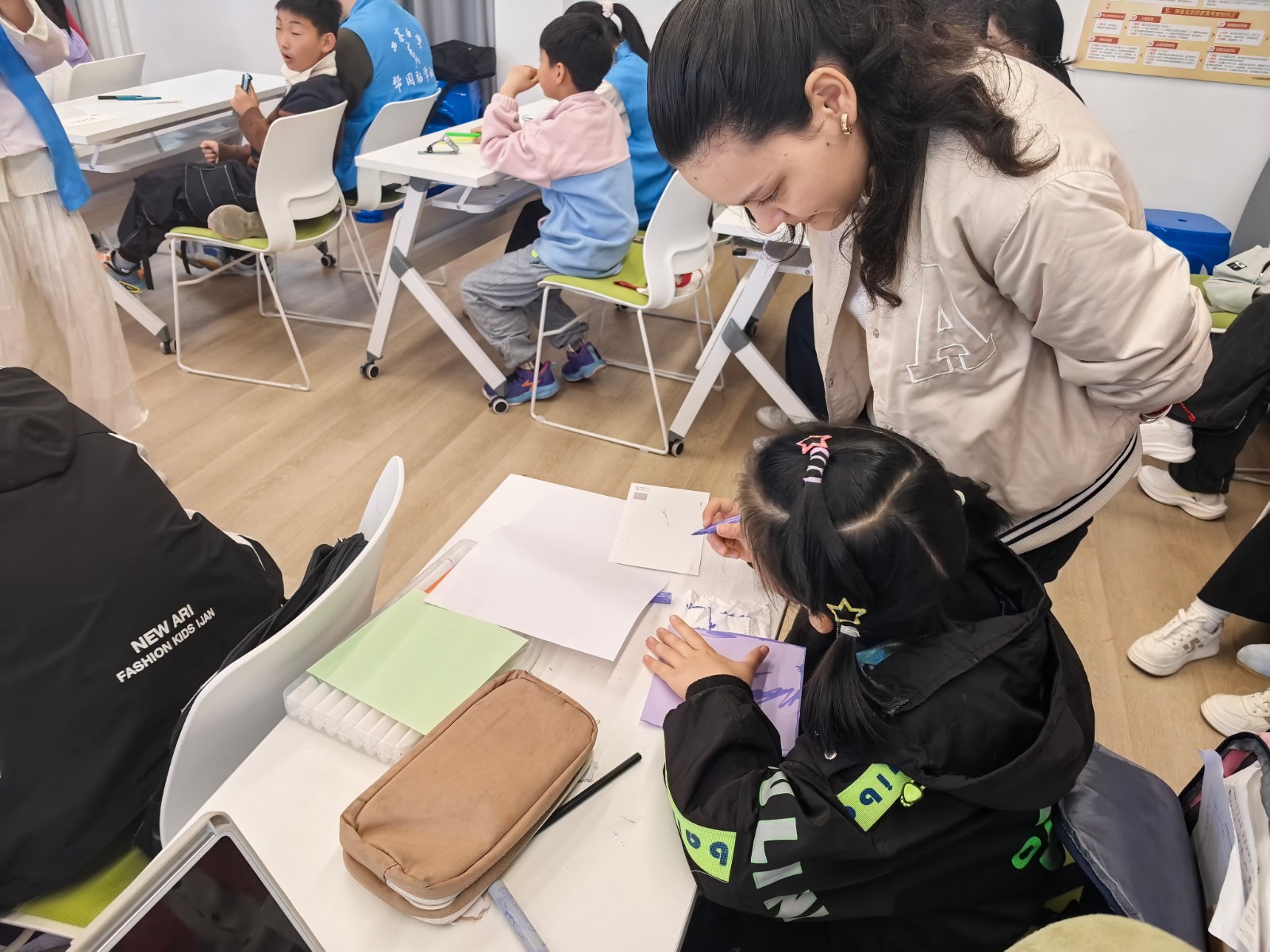 在社区党总支的统筹下,社区主动与宁波大学商学院对接。宁大商学院积极响应配合,精心选拔了一批品学兼优、热心公益的优秀留学生志愿者加入社区“双减”服务队伍。这些留学生带着开阔的国际视野和纯正的外语口语走进课堂,不仅填补了新就业群体子女在优质外语教育资源上的空白,更显著提升了公益课堂的专业性和吸引力。