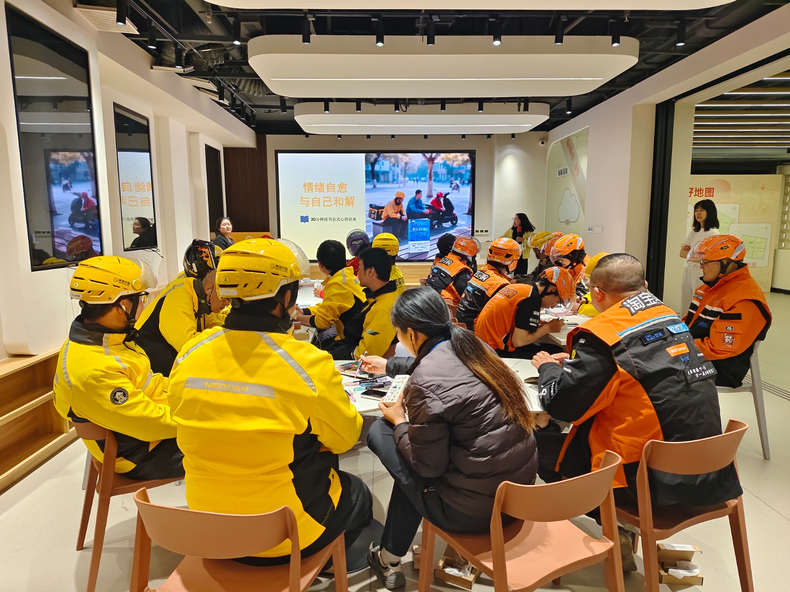 送餐路上的奔波、偶尔的误解与差评、倒计时下的分秒必争……外卖骑手的辛苦,不只写在脸上,更在心底里。4月21日下午,一场专为外卖骑手量身打造的心理疗愈读书会在北仑区新就业群体党群服务中心温情上演。活动以“为心充电 为爱续航”为主题,通过读书与绘画相结合的方式,为平日里奔波在大街小巷的外卖骑手们送上了一份别样的心灵关怀。