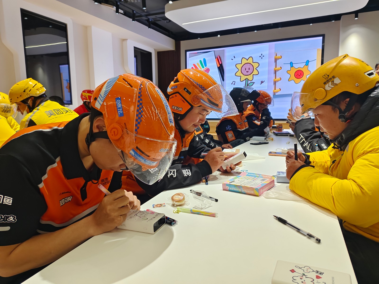 读书环节结束后,活动进入了富有创意的绘画疗愈环节。大家拿起画笔,在充电宝上自由创作——有人画了灿烂的笑脸、七色的彩虹,也有人写下了“加油”“今天也要开心”等正能量语句。充电宝本就是骑手们日常工作中不可或缺的随身物品,如今被赋予了特殊的心理意义。当他们在奔波途中为手机充电时,也能一眼看到自己亲手绘制的暖心图案,让心理能量随时随地“满格续航”。