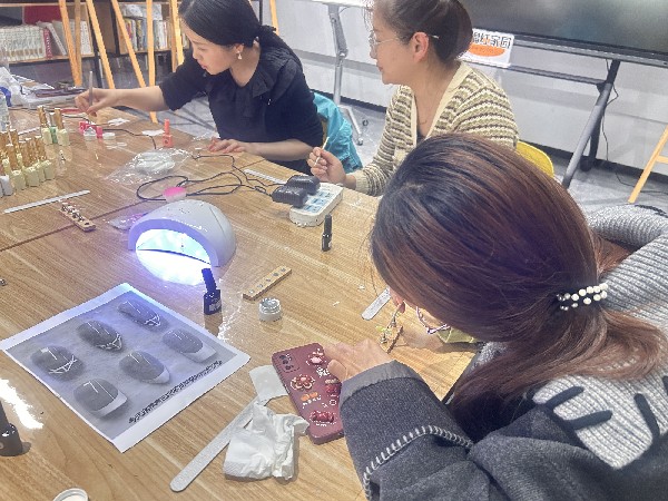 课堂上,专业美甲老师从基础理论入手,为学员们讲解了指甲护理、甲型修整、甲油胶涂抹、基础配色等实用知识,结合示范视频拆解操作要点,让零基础的学员也能快速理解。随后,老师手把手指导大家在练习甲托上实操,针对涂胶厚薄不均、线条不够流畅等问题逐一纠正,耐心示范取胶、刷胶、照灯固化的完整流程。学员们围坐桌前,手持工具认真练习,在老师的指导下不断调整手法,从最初的生疏紧张,到逐渐掌握技巧,一步步完成了属于自己的第一份美甲作品。“没想到下班后来学美甲,不仅学会了新技能,还认识了志同道合的朋友,感觉生活都变得更有趣了!” 一位学员开心地说道。大家相互交流心得、分享技巧,氛围轻松又热烈。