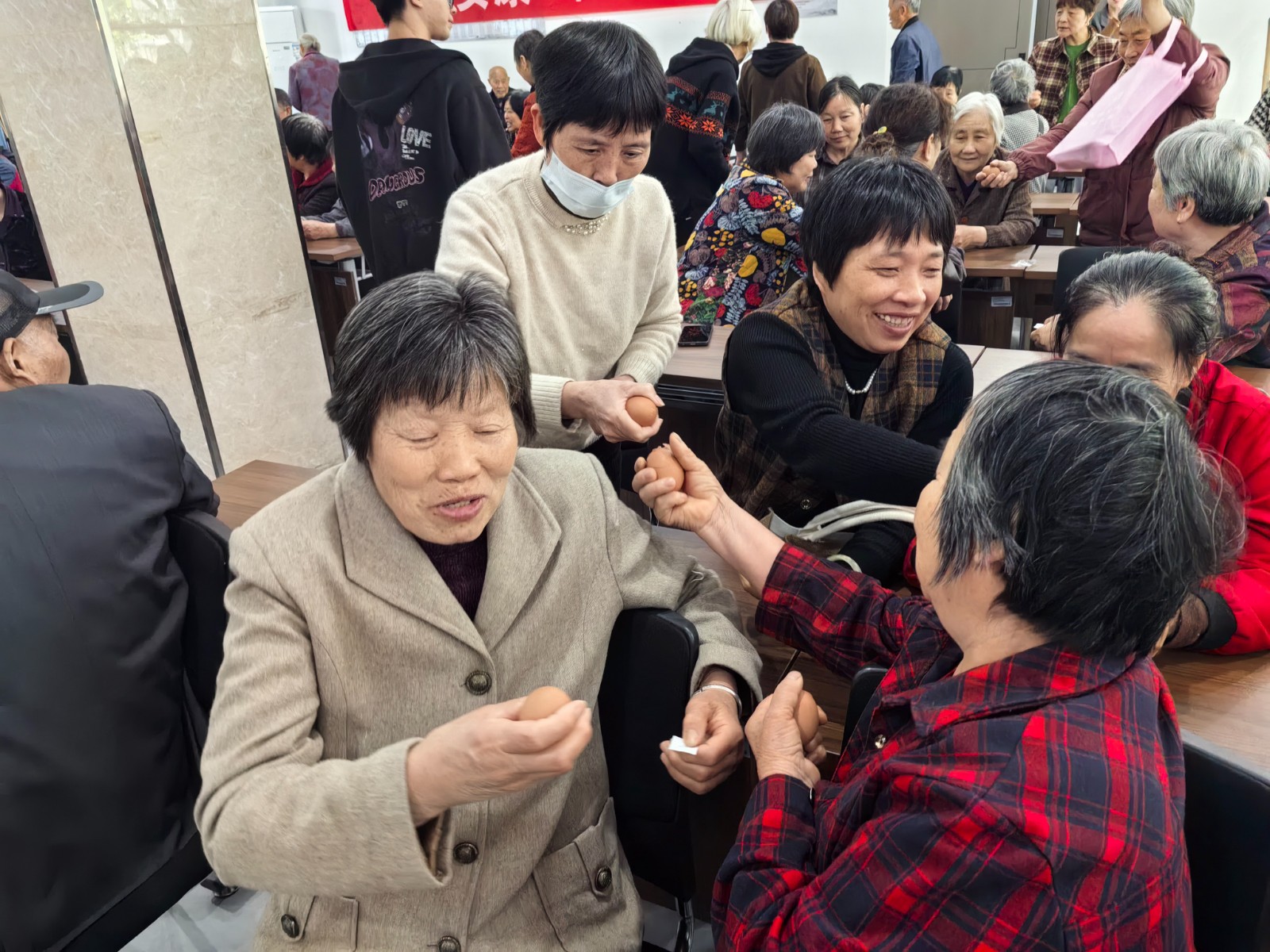 4月24日上午,广源社区老年大学暖意融融、欢声阵阵,早已变身成为一片欢乐的海洋。活动现场,最具立夏特色的碰蛋环节火热启幕,老人们手持彩蛋,两两相对、轻轻相碰,清脆的碰撞声里,既有传统习俗的独特韵味,也盛满了邻里相伴的欢喜。大家在趣味互动中感受立夏的气息,在亲切交谈中拉近彼此距离、增进邻里情谊。与此同时,社区工作人员还带着精心准备的立夏蛋,上门走访慰问高龄老人,把节日的祝福与社区的温暖,亲手送到老人们的心坎上。