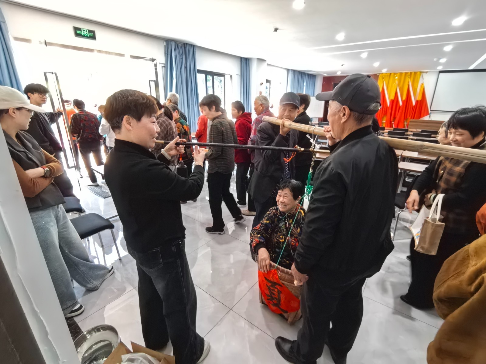活动现场还有一处别样的风景线——古老的箩筐“变身”成了充满趣味的体重秤。老人们童心未泯,排着整齐的队伍,带着好奇与期待依次站进箩筐,在工作人员的细心协助下,完成了一次别具一格的称重体验,现场不时响起阵阵爽朗的笑声,岁月的温情与童年的乐趣在此刻完美交融。