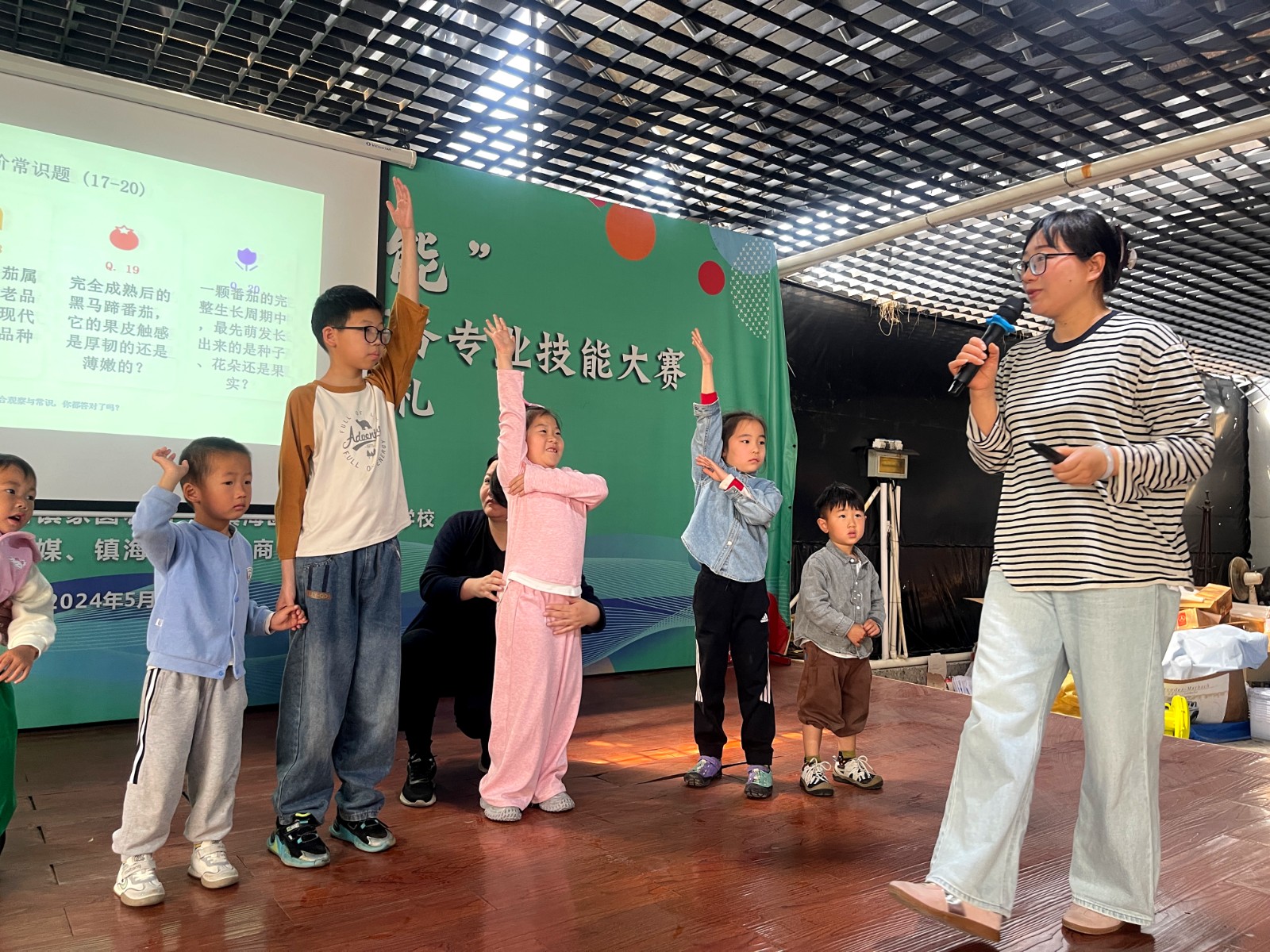 家圆农场拥有独家特色黑马蹄番茄,培育的酸甜果斩获全国比赛金奖,独具地域特色。活动伊始,研学老师开展番茄知识科普,讲解番茄生长习性、品种特点等知识,穿插趣味小常识,激发孩子们的探索兴趣。随后的趣味有奖竞猜环节气氛热烈,孩子们踊跃举手、积极抢答,活动人人有奖,现场欢声笑语不断。一名2岁6个月的幼儿,在爸爸陪同下勇敢登台参与,虽未答出问题,也收获了鼓励奖品,温情满满。