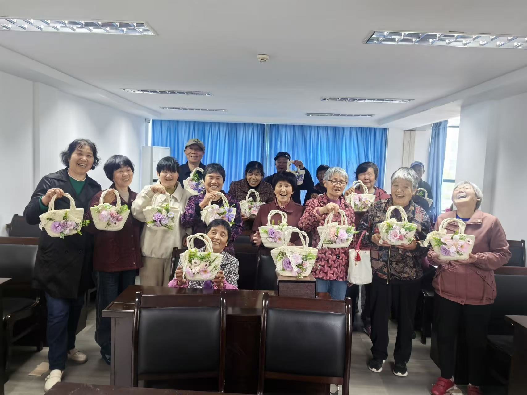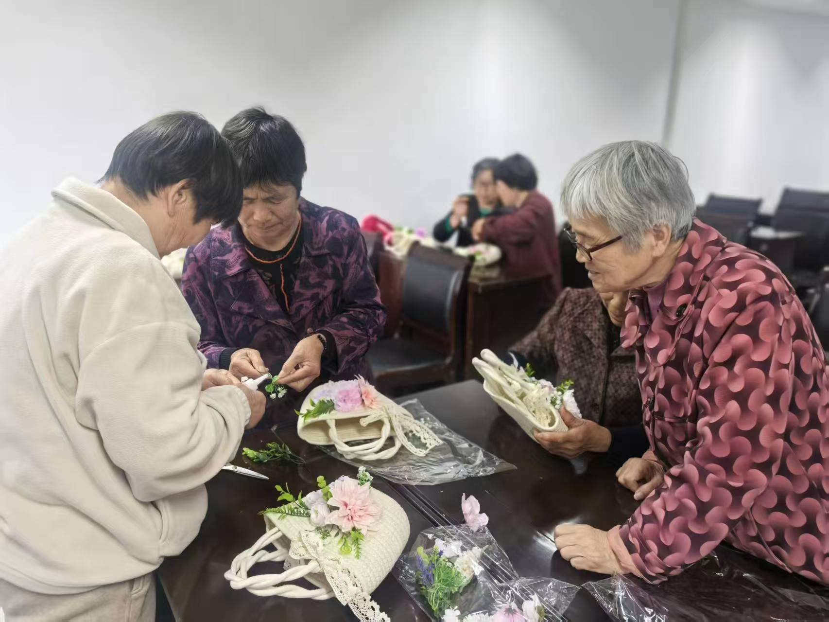 活动现场欢声笑语不断,长者们充分发挥创意,将鲜花、干花与提篮包巧妙融合,一个个精致别致的踏青提篮包陆续成型。大家互相交流心得、展示作品,现场洋溢着温馨愉悦的氛围,工作人员也为老人们拍照留念,定格美好瞬间。