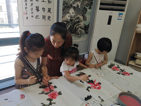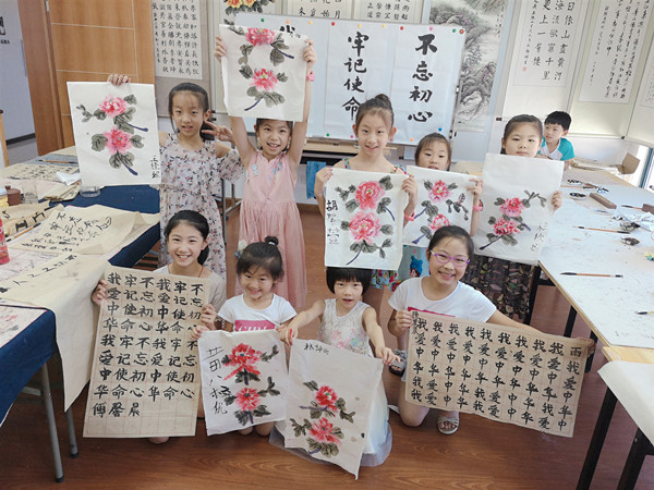 7月23日上午,百灵社区假日学校组织学生开展“同心绘牡丹  共書中国梦”书画课堂。