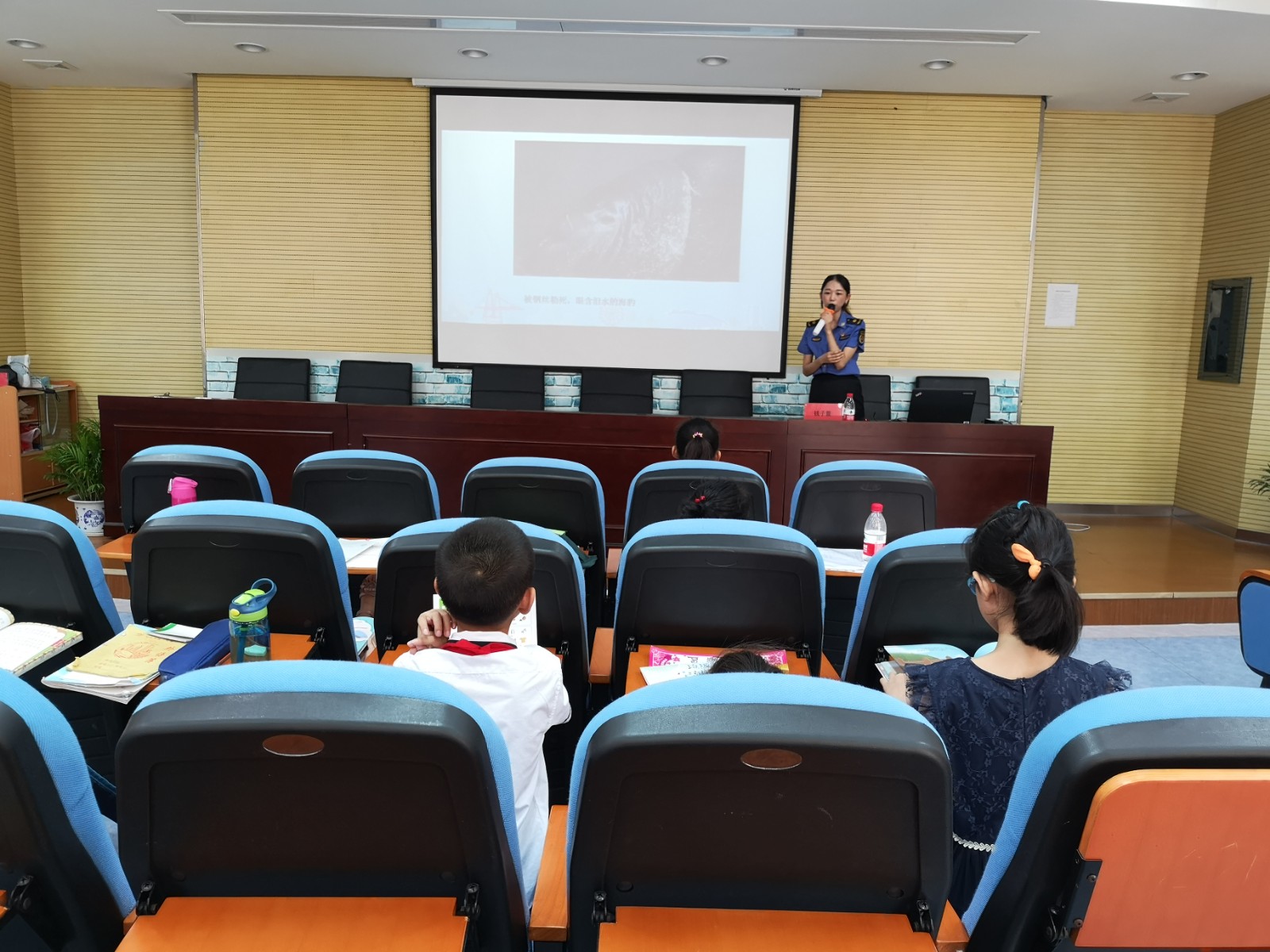 张老师首先以图片的形式来呈现、介绍全球的环境现状:母鸟归巢用塑料垃圾喂食小鸟、北极熊因垃圾而变更毛色、死鲸解剖胃里是漫溢的塑料……一张张幻灯片的放映无不牵动着台下孩子们单纯、善良的心,同时也让孩子们意识到垃圾分类对环境的重要性。