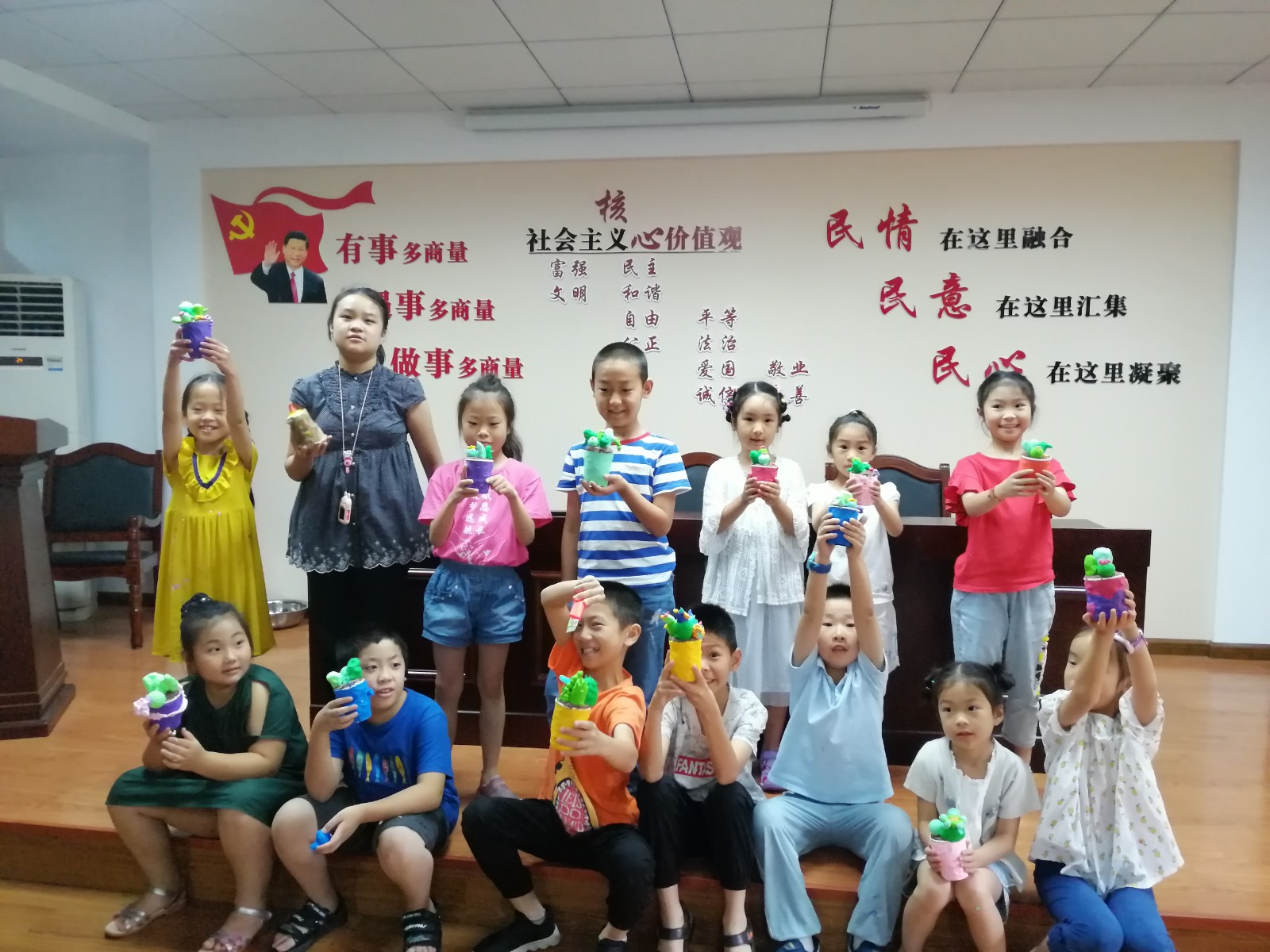 彩泥老师杨老师先给青少年们简单介绍了垃圾分类的知识和理念,然后根据彩泥的特点,并给孩子们展示了彩泥的植物(多肉)作品。随后,孩子们跟随着老师的步骤,挑选自己喜欢的彩泥颜色,运用揉、捏、搓、压等技巧做出各种多肉品种的作品。下课后,孩子们纷纷将自己的作品展示给家长,活动现场十分热闹。