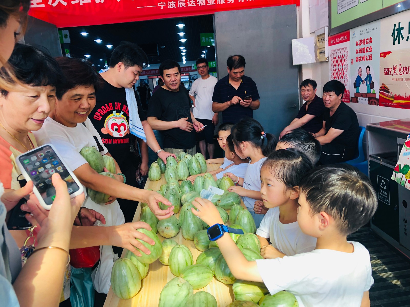 孩子们在爸爸妈妈的陪同下早早来到了莲晴社区“田恬圈”农耕教育基地,用小剪刀、小锄头,摘下了一个个西瓜、海东青。值得一提的是,这些瓜果都是几个月前孩子们亲手播种下的,天气炎热,孩子们不一会儿就大汗淋漓,但是把自己亲手种植的西瓜送到环卫工人手中,他们一点都不觉得辛苦。