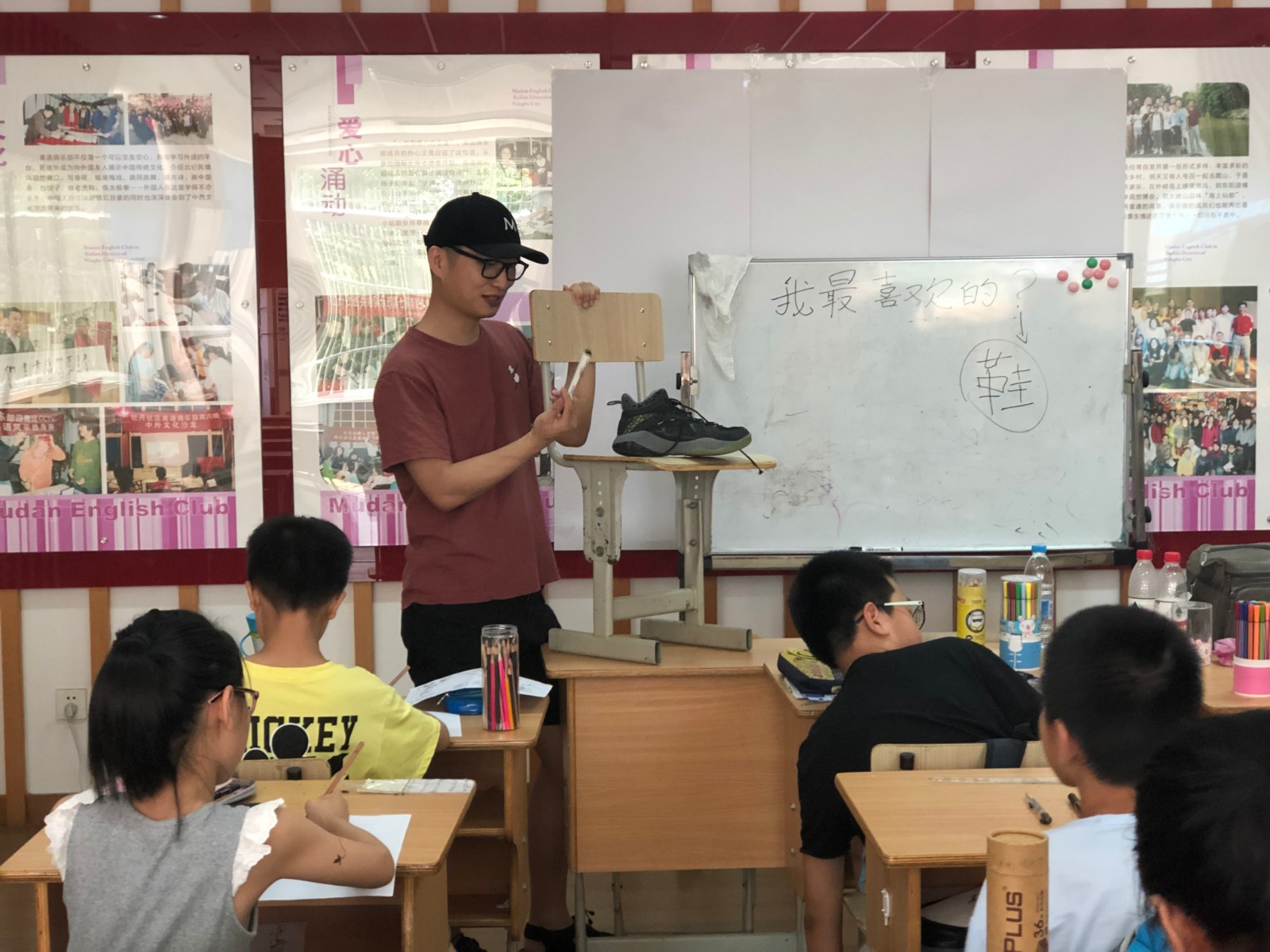 课堂伊始,朱老师先是在白板上写下自己最喜欢的是——“鞋”,随即,掏出自己准备好的一只运动鞋,带领着大家逐步认识鞋的构造——鞋底、鞋舌、标识等。朱老师给大家一分钟的时间观察自己的鞋子,为接下来的作画做好准备。紧接着,朱老师在白板上画下了鞋身和鞋底,并用一个孩子的凉鞋作为另一个参考,教孩子们不同的鞋子应该怎么画。下一步就是画上鞋带,两条线一个圈,一条鞋带就画好了。接着,从几条鞋带中间画出鞋舌,给鞋带打上蝴蝶结,几笔勾勒之下,一个鞋子就初具雏形。朱老师随后教导孩子们注意细节,如果这双鞋磨损过多,就可以在鞋头和鞋身画出破损的痕迹,或是补充上鞋子本身独具的花纹,这样每一双鞋都有着不一样的特点。最后,朱老师要求孩子们在现有的画上做一些改造,可以给鞋子加上轮子,或是添上翅膀,开发自己的想象力,打造属于自己的独一无二的鞋子。铅笔打完稿后,孩子们用勾线笔勾线并用水彩笔上色,一个个别具风格的鞋子就跃然纸上。