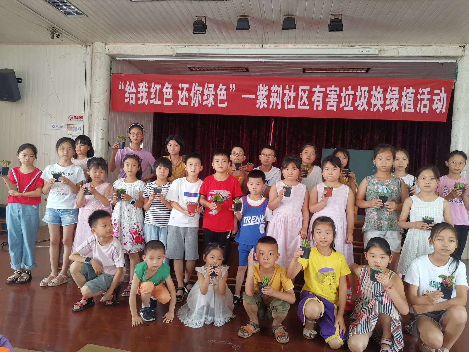 为了更好的引导学生将有害垃圾从生活垃圾中分离出去,提高学生及居民的环保意识,紫荆社区举行了“给我红色,还你绿色”有害垃圾换绿植活动,学生们可以用家里的有害垃圾来换取一盆可爱的绿色植物,用绿色装饰家园。
