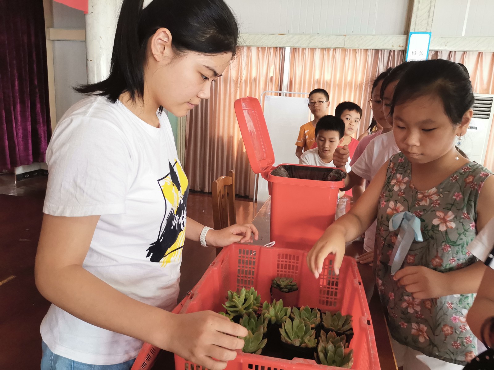 一盆盆绿意盎然的多肉在台上依序摆放,在偌大的教室呈现出一片绿色的风景。学生们兴致勃勃地研究着每一盆绿植的大小和形状,嘀咕着自己喜欢的绿植。活动伊始,学生们井然有序地排队,依序将手机电池、过期药品、废旧灯泡等有害垃圾投入红色的有害垃圾回收桶内,换取自己心仪的多肉植物。学生们一个个盯着自己手里小小嫩嫩的绿植,露出开心的笑容。