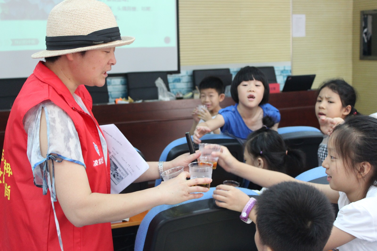 在中草药辨识环节后,胡老师首先通过《神农尝百草》、李时珍著《本草纲目》等经典小故事来向小朋友们展示中草药的悠久历史。随后,伴随着一个个中药材实物的出现,课堂的气氛逐渐升温至最高点。胡老师在介绍诸如“驴皮”、“紫苏”、“茯苓”等药材功效和有趣的历史小故事的同时,还将其他药材泡茶、自家种得的小南瓜以及自制陈皮分发给小朋友们品尝,带给孩子们视觉和味觉的双重体验,给他们留下了极为深刻的印象。