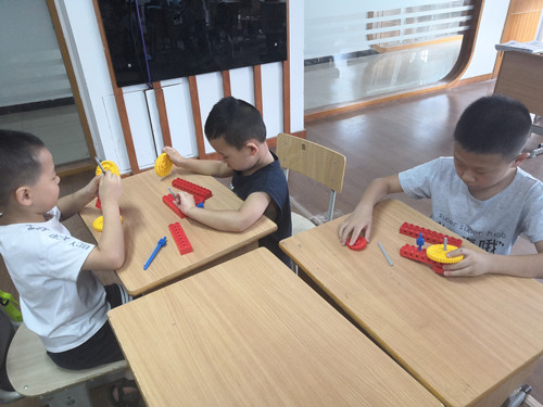课堂伊始,老师先大致介绍齿轮的作用引起孩子的兴趣,齿轮有大有小,大的齿轮为40转,小的齿轮为24转。随后老师展示已经制作好的陀螺,其中大轮和小轮通过梁贯穿在一起,摇动手摇柄,陀螺就可以发射了,既美观又有趣,孩子们都被深深地吸引了。简单地讲解之后,老师们将孩子们分组,每组四人,进行自主的陀螺搭建。老师们提醒孩子在搭建的时候注意蓝色的轴可以贯穿梁,它可以连接手摇柄和黄色的大齿轮。孩子们通过观察、操作、实验来认知,不断地组装与拆分,只为做出心里最完美的陀螺。完成拼装后,老师们一个一个进行成果检验,耐心讲解问题所在,对孩子们不吝于赞美与鼓励。最后,孩子们都成功地完成了陀螺发射。