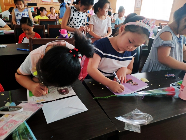 课上,社区工作人员王芳向小朋友们介绍了七夕节的由来、各地的七夕民俗活动,如穿针乞巧、投针验巧、拜织女、拜魁星 、晒书晒衣、贺牛生日等。随后,王芳分发给每个小朋友制作贺卡的材料,孩子们纷纷在贺卡上画上漂亮的图案,贴上各种花色,写上七夕对父母的祝福。活动最后,社区给每个小朋友发了一支玫瑰,小小的贺卡带着玫瑰的香气,配上他们独一无二的祝福语,承载着孩子们满满的真诚和爱心,传递到了每一位家长的手中。