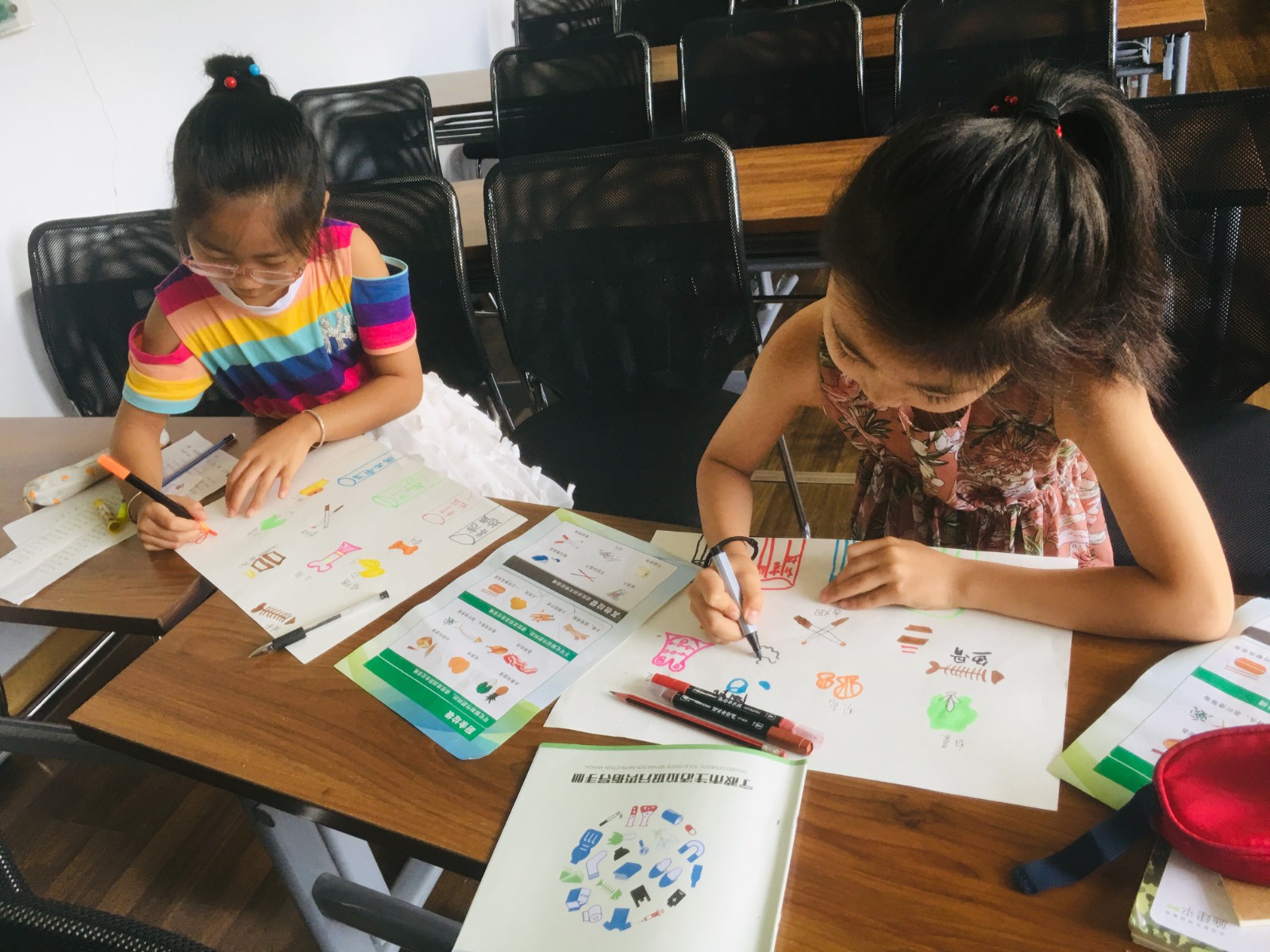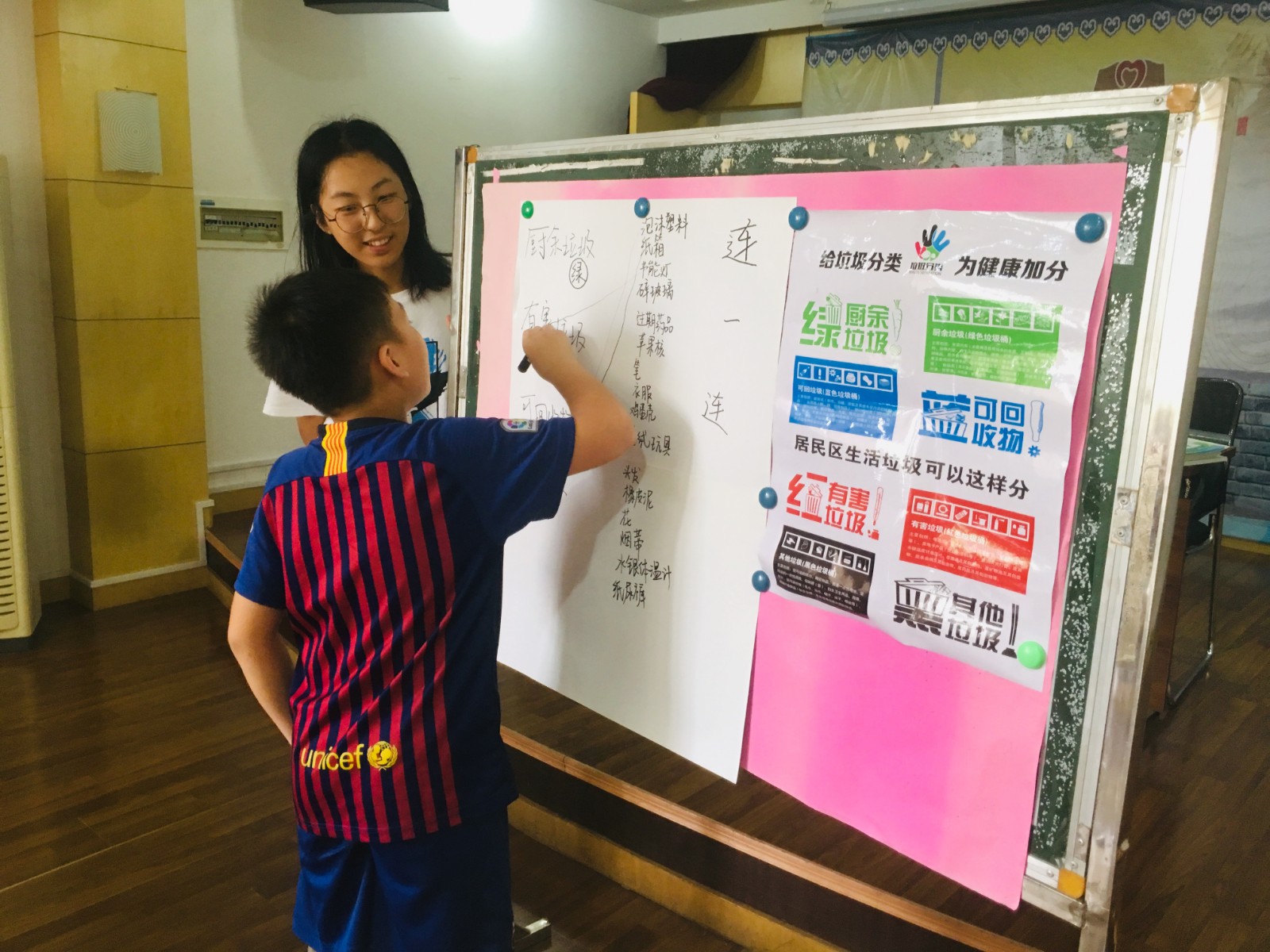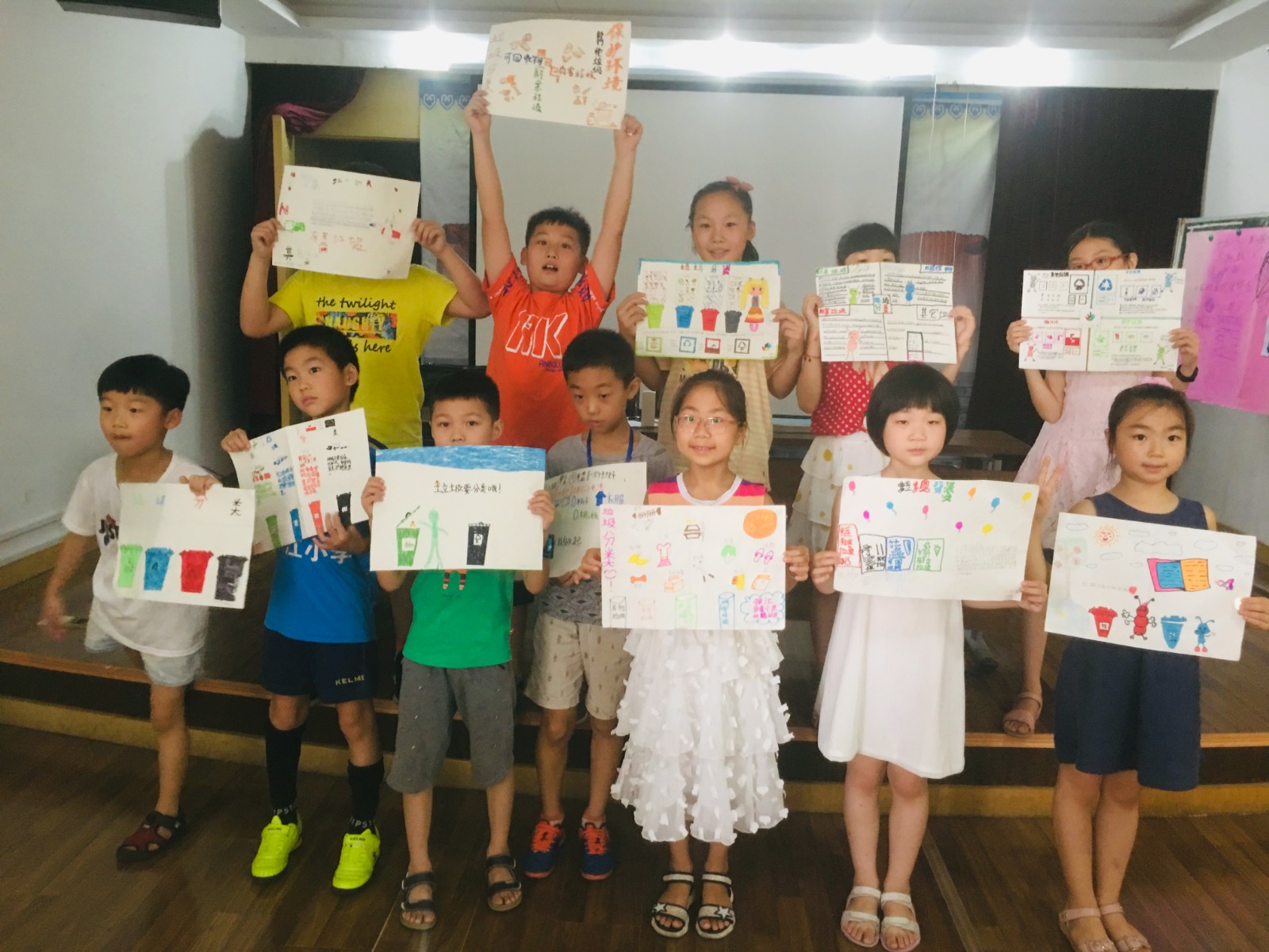 什么是垃圾分类?如何开展垃圾分类?志愿者从一首宁波地方版本的歌曲《什么垃圾》入手,简要介绍了垃圾分类的基本概念和施行原因。在孩子们简单了解垃圾分类的方法之后,志愿者设计了“连一连”“猜一猜”等小游戏,鼓励每一位孩子上台对相应垃圾进行分类连线,以此加深他们对各类垃圾的认识。通过问答和朗读的形式,志愿者将垃圾的投放指导和注意事项一一说明。在一波垃圾分类的考题后,孩子们迎来了最大的挑战——制作垃圾分类手抄报。孩子们创意巧妙,精心设计,充分利用手抄报这一载体,简化垃圾分类方法,以图文的形式宣传垃圾分类知识,充分发挥了他们的巧妙构思和参与热情。