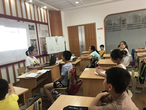 课堂伊始,志愿者通过各种科普小视频让孩子们了解成语的来意,这些动画小视频在孩子们面前展开了成语中所隐含的画面,使得孩子们在看故事中就能学习成语。看完科普视频之后,沈慧玲再通过造句的方法,让孩子们了解成语的使用语境与方法。在这节课上,孩子们学习了“完璧归赵”、“高山流水”、“七擒七纵”、“桃李不言,下自成蹊”、“悬梁刺股”、“背水一战”六个成语。最后,孩子们通过抄写成语及复述其大致意思,简单地复习了这六个成语。
