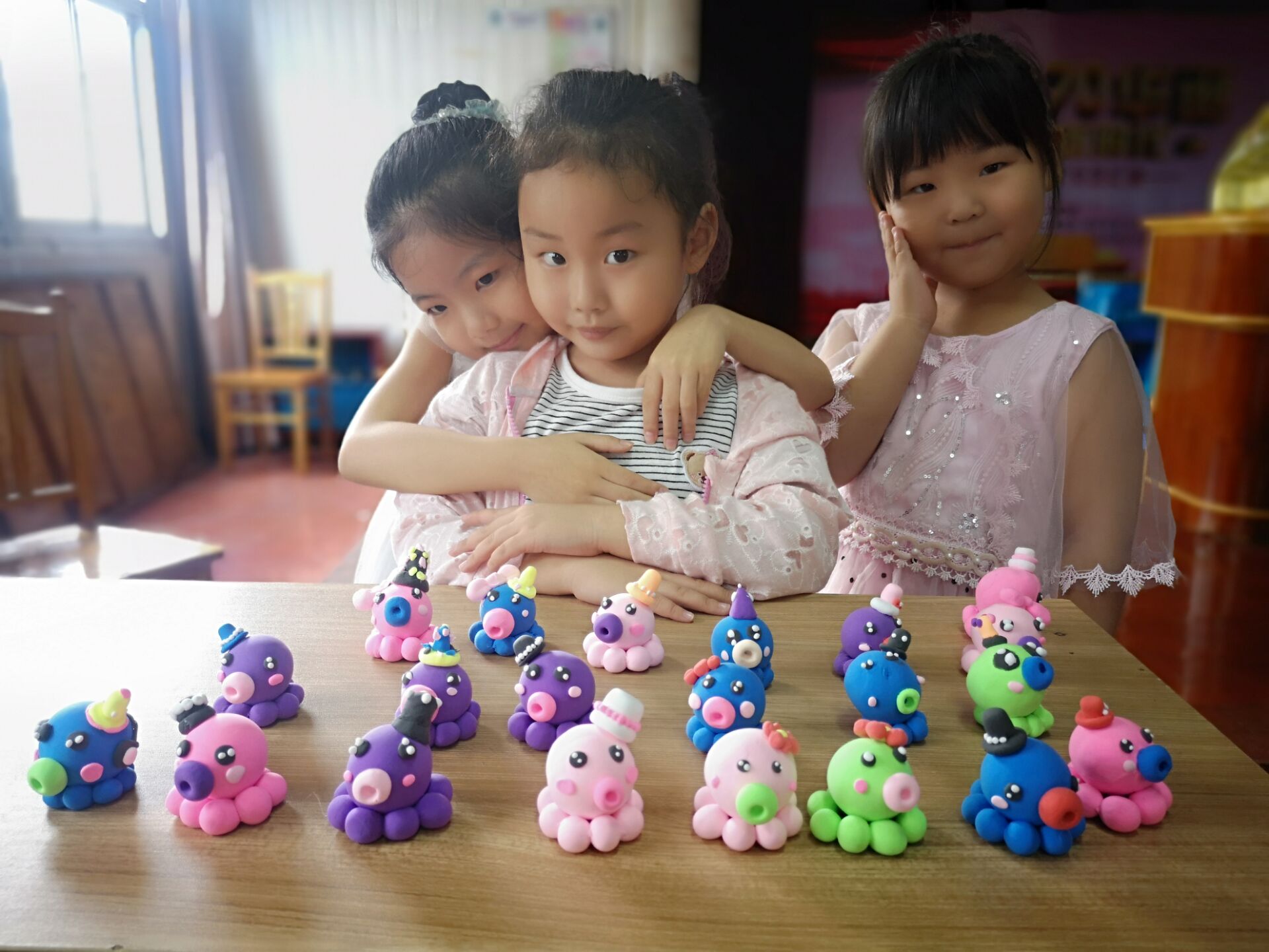 这堂课的主要内容是用超轻黏土制作一只卡通章鱼。林老师一步一步展示制作过程,边做边讲,告诉孩子们如何用手搓出章鱼圆圆的脑袋和八只腕足,如何用手捏出章鱼的眼睛和脸颊上的腮红,以及如何用小刀制作出章鱼的喷嘴。孩子们一边听着老师的讲解,一边认真地模仿老师的动作,不一会儿,栩栩如生的章鱼就在孩子们的巧手之下诞生了。接着,林老师让大家充分发挥想象力,为自己的章鱼制作头部装饰品,可以是帽子、皇冠、蝴蝶结等。最后,孩子们拿着自己制作的章鱼拍照留念,脸上展露出了骄傲的神情与灿烂的笑容。