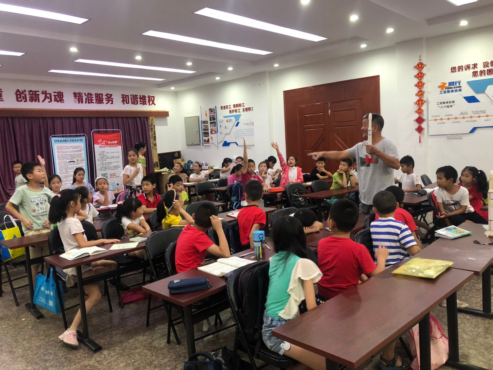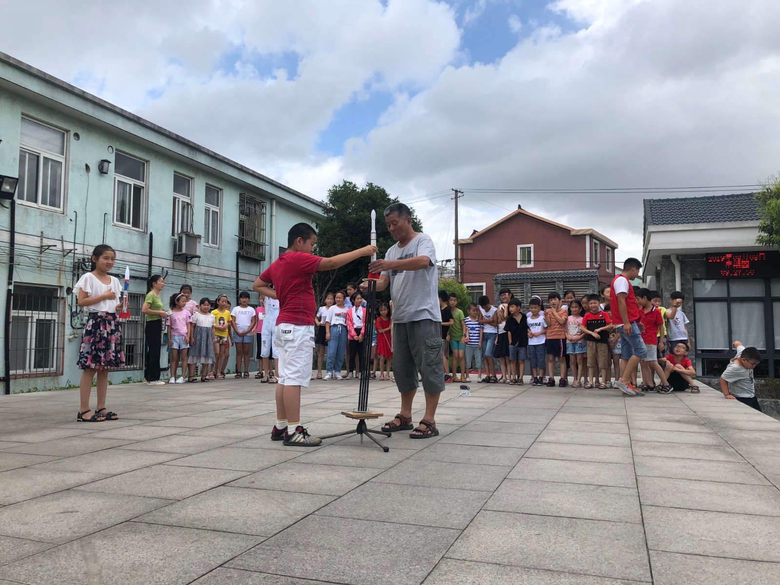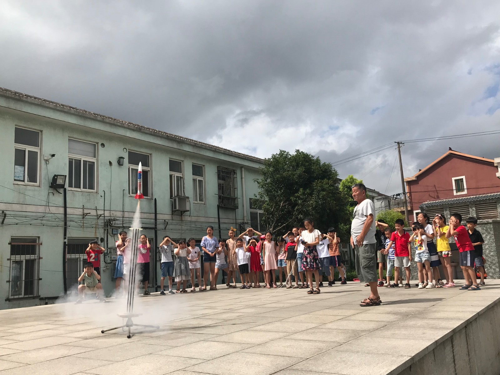 课上,林老师热情地给同学们科普火箭知识,用妙趣横生的语言讲解枯燥乏味的科学术语,小朋友们听得格外认真。随后,林老师给同学们分发了制作火箭的道具,在老师的细心教导下,同学们制作了火箭模型。最后,林老师带着同学们来到社区的广场,准备发射“火箭”, 这些火箭满载着同学们的希望,飞向天际。
