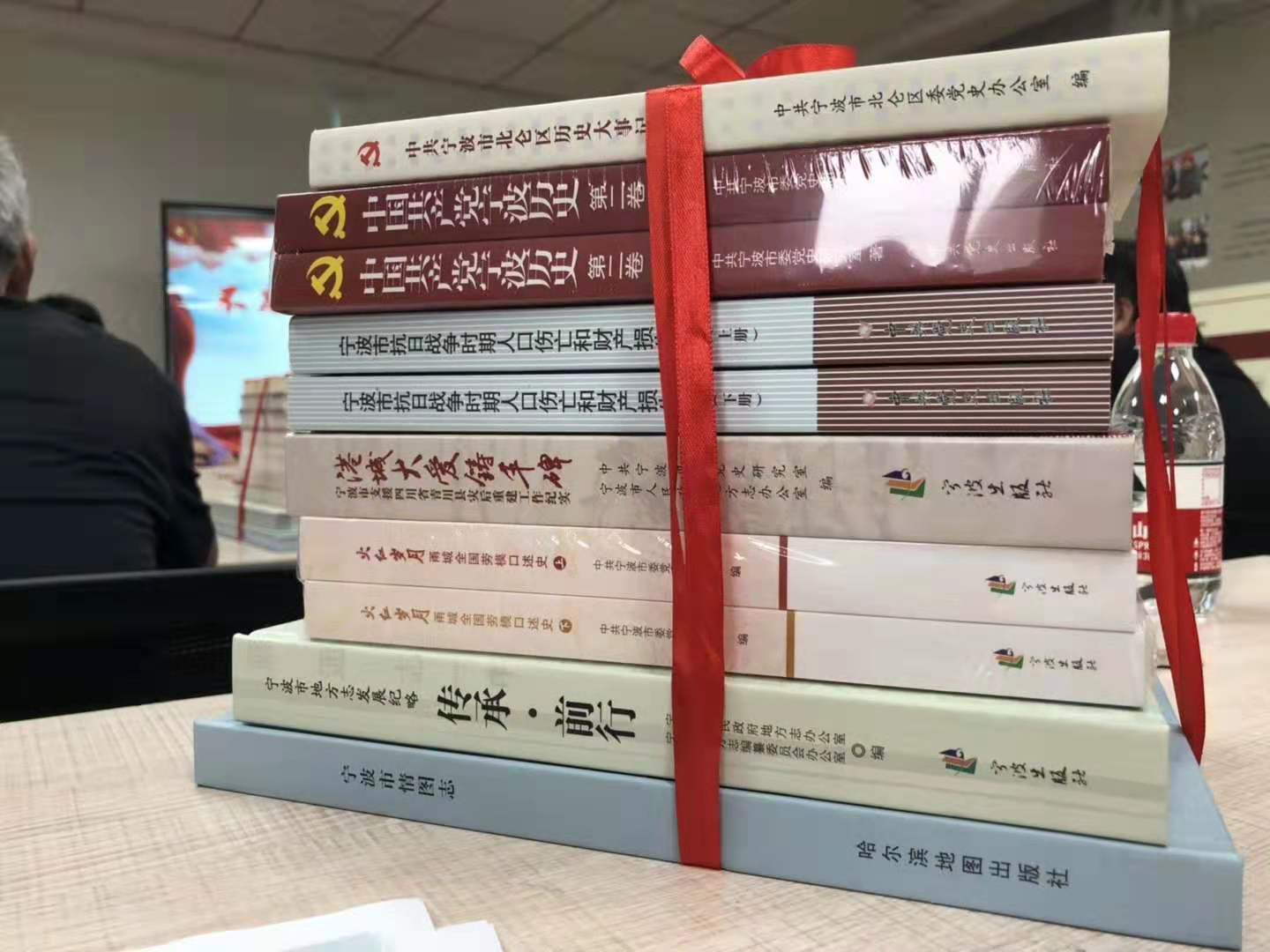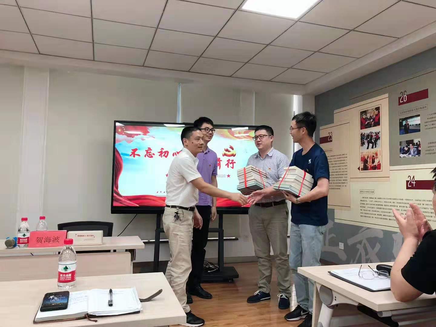 活动第一项议程是由市委党史研究室副调研员朝泽江、区委党史办副主任贺海波为辖区优秀企业海伯公司、宁波钢铁代表赠书,随后进行第二项议程,由朝泽江讲师为党员们带来党课《不忘初心 砥砺前行——宁波解放70年发展历程回顾》。