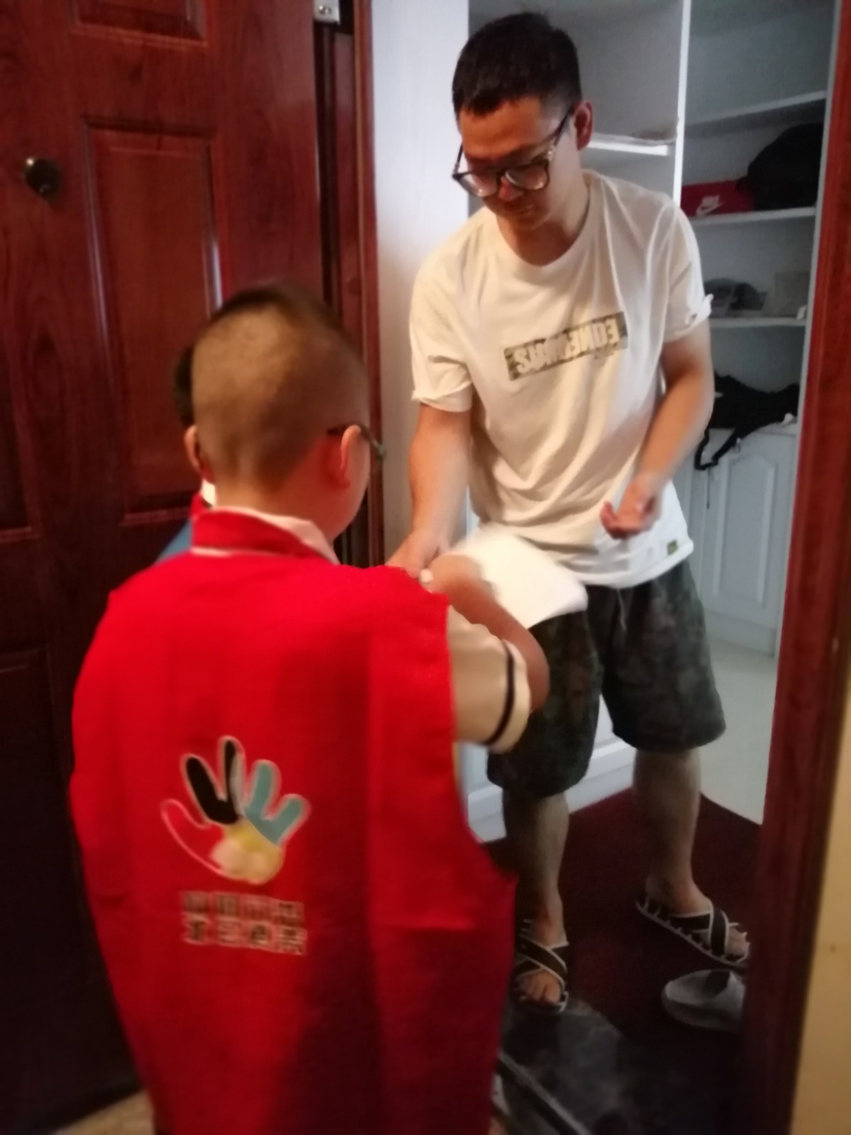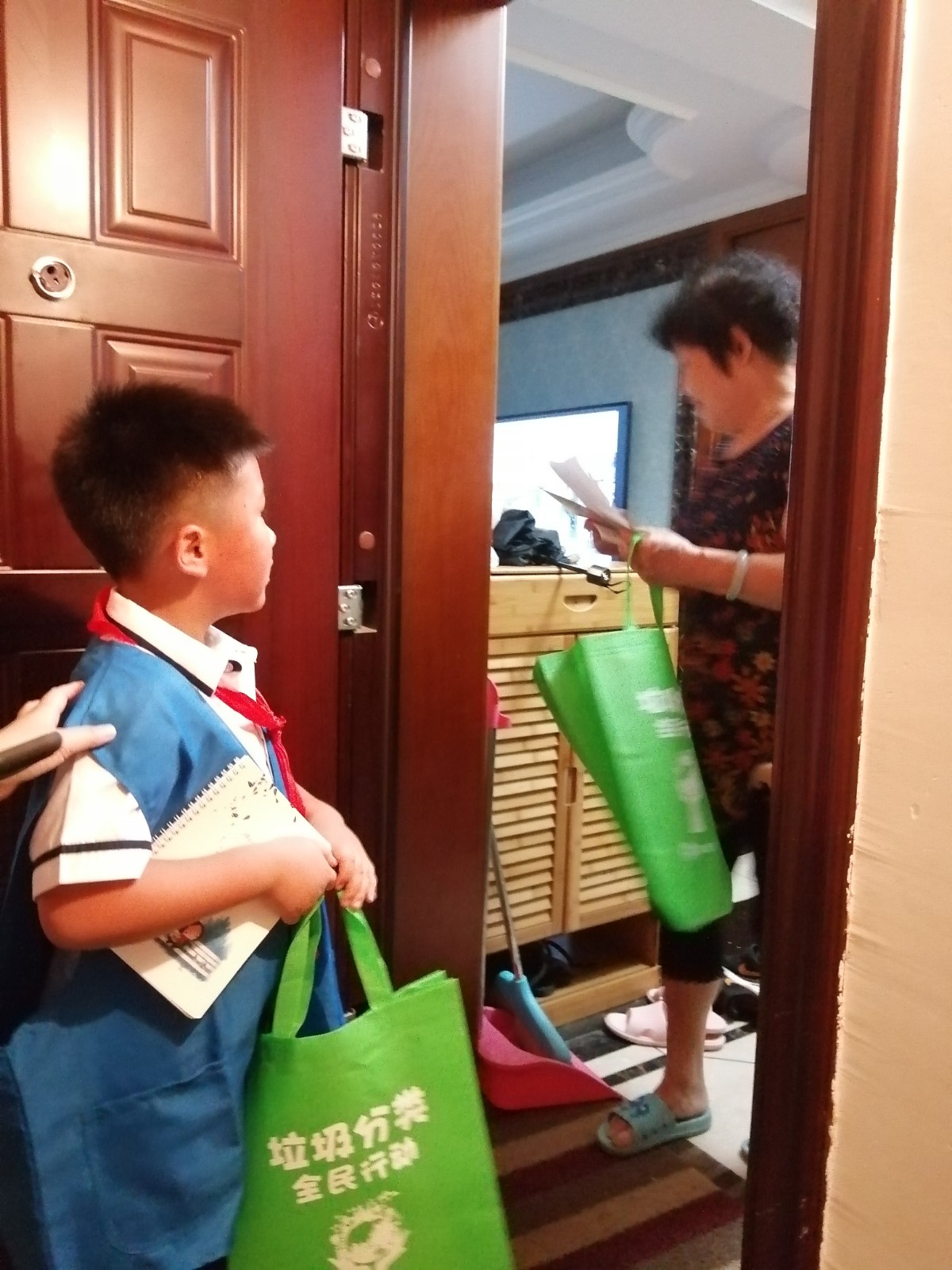 在接下来的入户宣传中,学生志愿者挨家挨户向居民们发放垃圾分类宣传册,并细心为居民朋友们进行简单的讲解,尽管天气炎热,但他们对活动的热情不减,依然坚守岗位,为垃圾分类事业奉献自己的小小力量。
