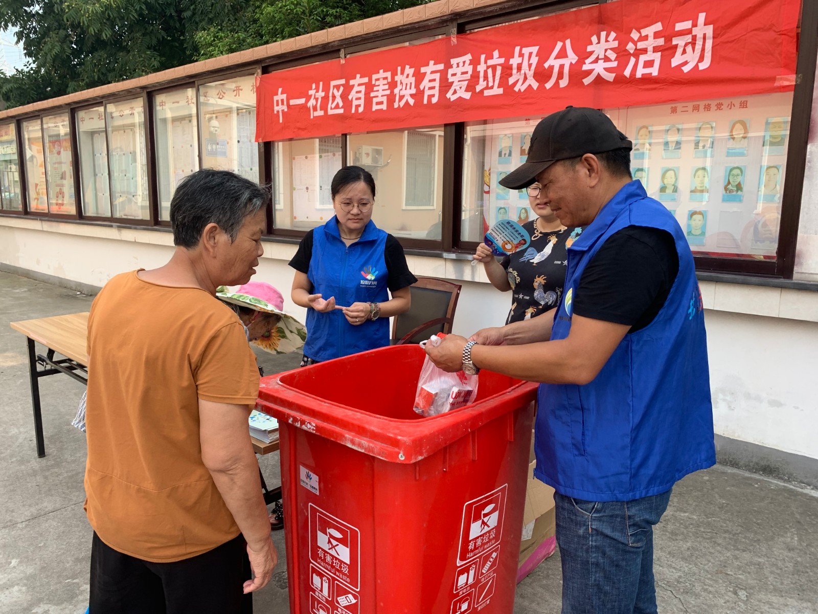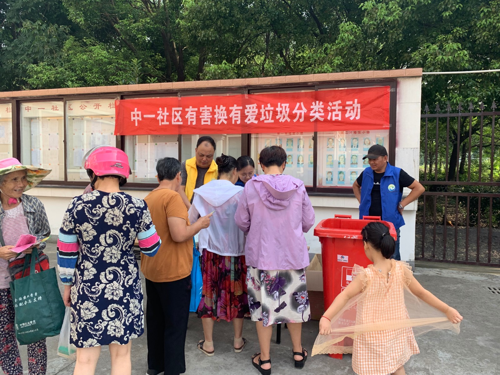 为提升居民垃圾分类意识和参与意识,号召社区居民积极参与垃圾分类活动,从身边做起、从点滴做起,自觉、科学地开展生活垃圾分类。8月21日,中一社区举行了“垃圾分类,有害换有爱”活动,现场居民带上家中的有害垃圾,前来社区进行小纪念品兑换,将家中过期药品、废旧家用小电器、过期化妆品等有害垃圾带来。社区通过此次活动,提高居民垃圾分类意识,提高居民分类热情。