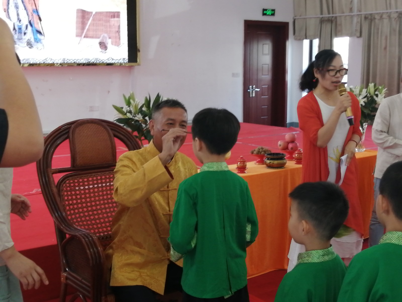 孩子们在指导老师的帮助下穿上汉服,席地而坐。八点半“启蒙礼”正式开始,全体起立,由老师指导小朋友正衣冠,并跟着老师一起向中国古代思想家、教育家孔子像作揖并送上祭果。参拜后,小朋友们排着队,挨个让长辈在小额头上点朱砂,并击鼓明志。