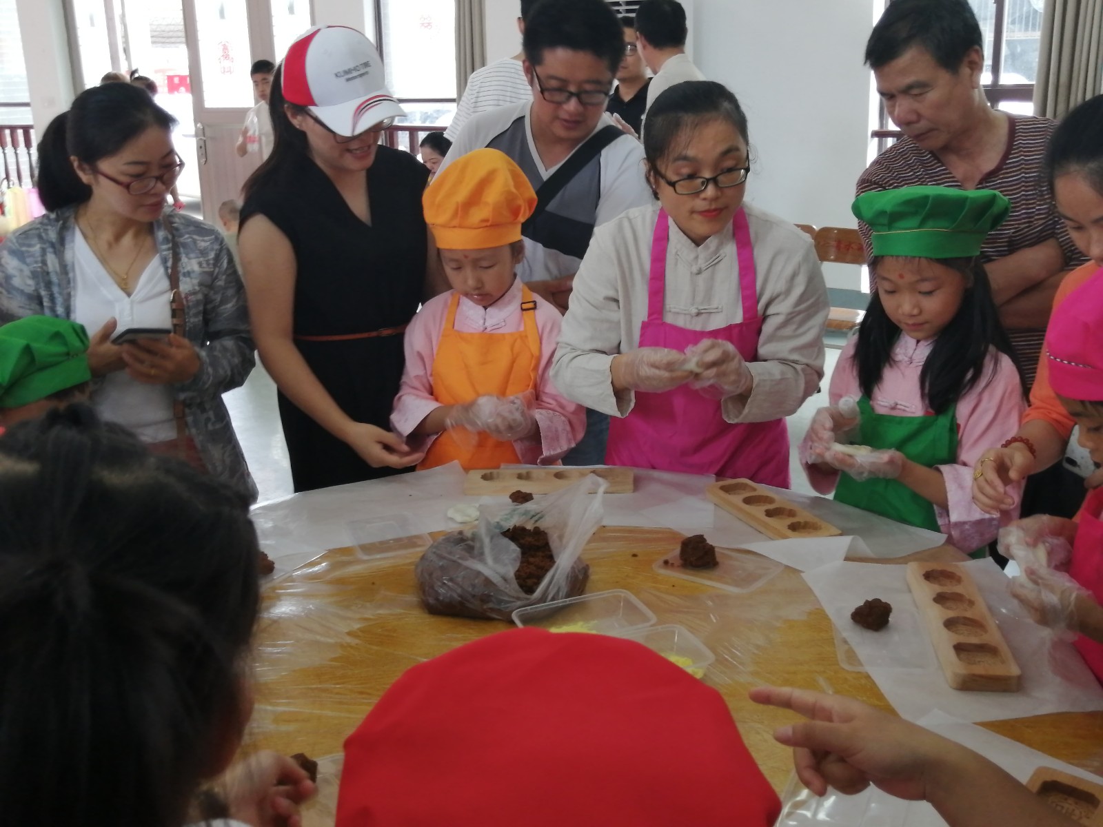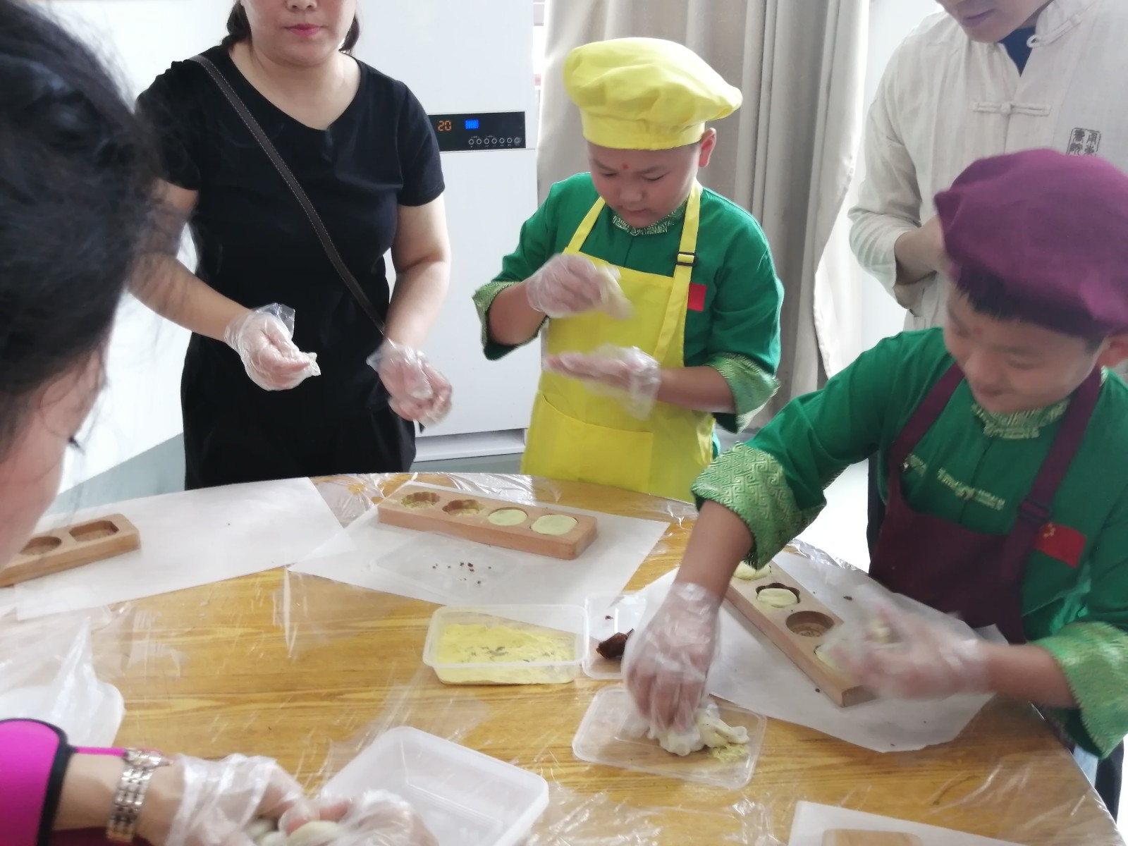 在活动中,宽敞的文化礼堂中摆下四张大圆桌,小朋友们手上套上一次性手套,围上小围裙,有模有样地跟着龙凤金团制作技艺传承人的张瑾山老师一起学习。只见张老师熟练地把熟糯米团均匀分成几个小团子,再把团子弄扁平,用小勺加入适量的豆沙馅,把馅裹入后,搓一搓裹上一层松花粉。在印花模具中将团子用力压平,再将模具翻过来轻轻一磕,一个漂亮的金团就制作好了。