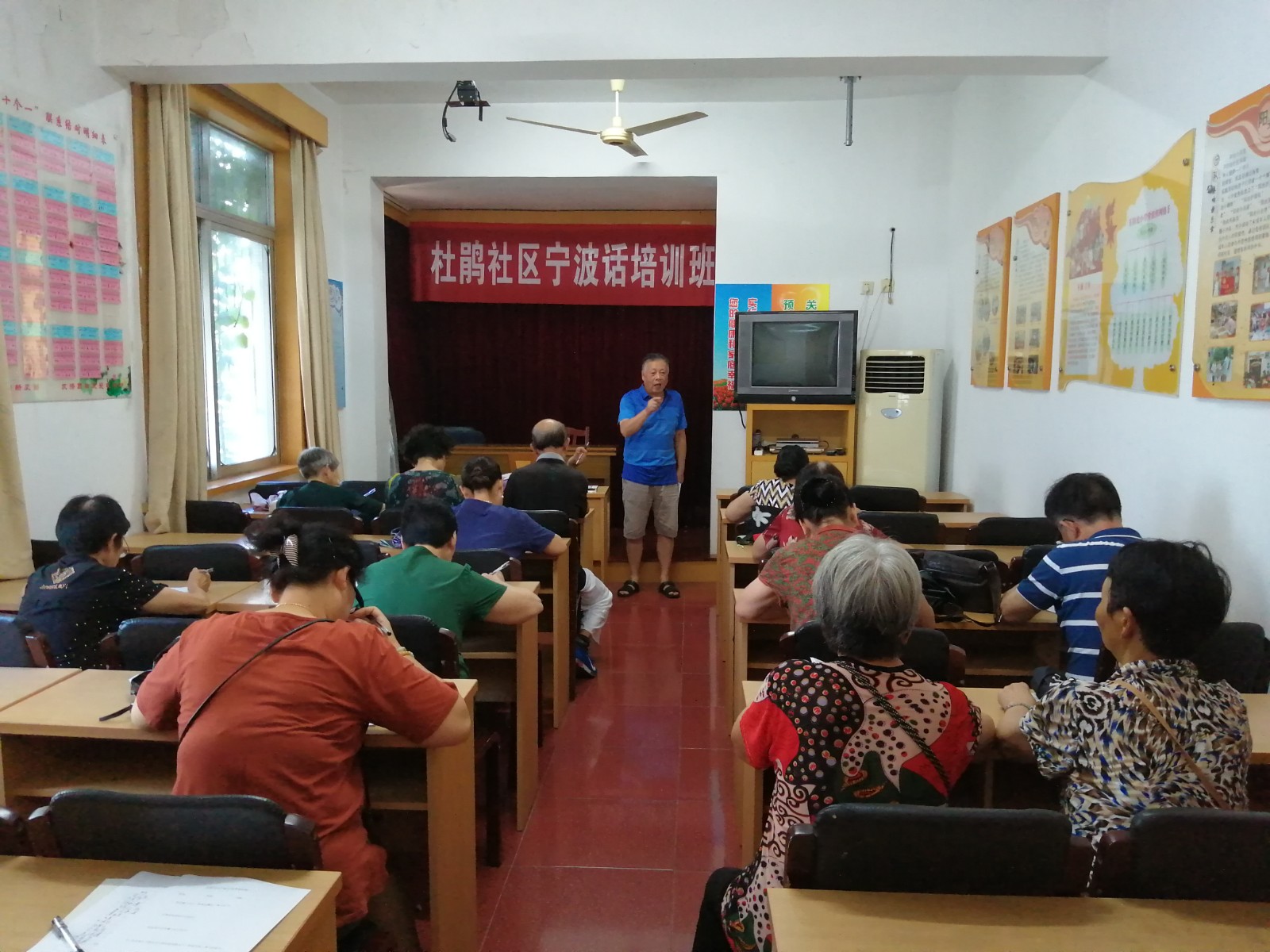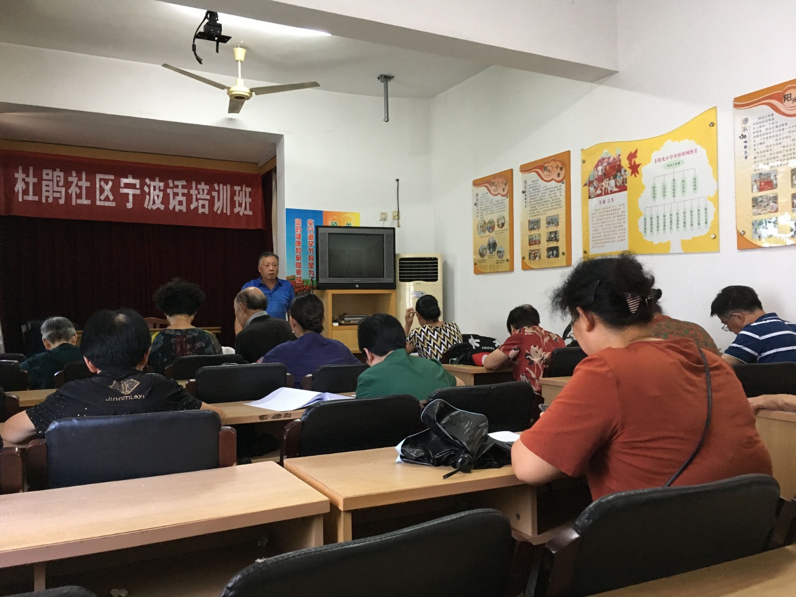 “宁得侬交关开心!”“哑犯吃过勒伐?”老年活动中心传出来朗朗读书声,原来这里正在开展宁波话教学活动。郑老师是退休教师,也是老年协会的会长,是地地道道的老宁波人,教学经验丰富,此次宁波话教学就由他来带领学员们学习。郑老师讲课风趣幽默,在教学中穿插了一些宁波本地的风土人情故事,还推荐学员每天观看《来发讲啥西》《讲大道》等电视节目。学员们跟着郑老师,一句一句地进行练习,改善口音,从常用词语到句子,再到对话,都是从居民的生活常用语入手,通过听、说、练相结合,使学员在轻松、愉快、活泼的气氛中学说宁波话。