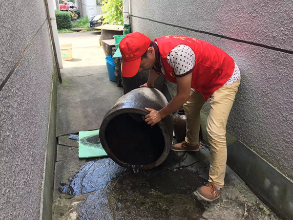 一早,社区教育工作者者、灵煦“e乡”志愿者、居民代表等多方人马齐齐出动,深入瓶壶南苑、瓶壶中苑及瓶壶北苑小区进行预防登革热宣传,并帮助居民倾倒家中及住宅周围的缸、罐、陶瓷器皿、塑料瓶等积水容器,告知居民对水养植物及时更换清水,杜绝蚊虫生长。同时,社区通过电子屏、广播、微信群等平台宣传防蚊防疫知识,营造氛围,让居民正确全面了解蚊虫危害。接下来,社区将针对各绿化带、阴暗弄堂、公共厕所、垃圾收集点等场所进行消杀,从源头切断蚊虫的孳生。